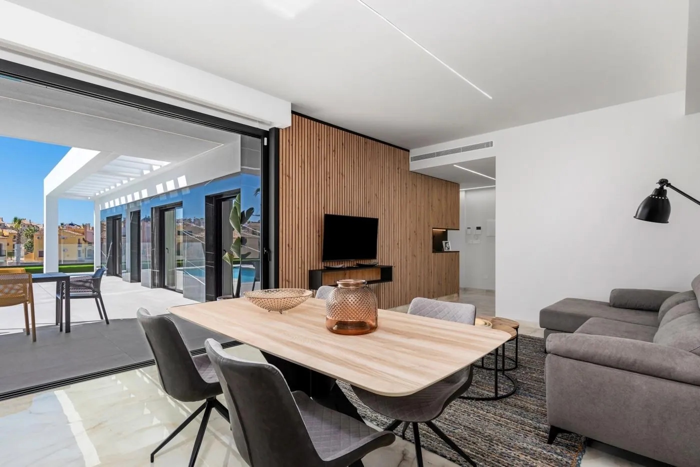 open keuken, de woonkamer met een open uitzicht op het terras, solarium, prive tuin met het zwembad en parkeerplaats.