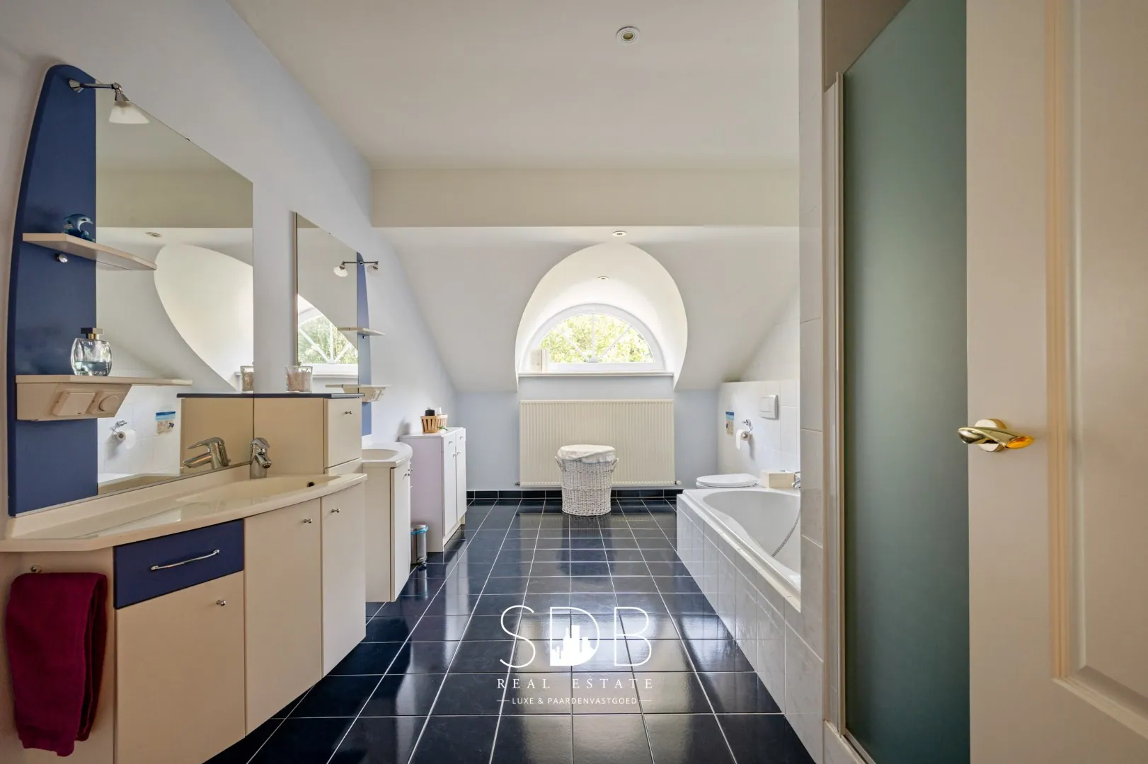 De 2de badkamer beschikt over 2 lavabomeubels, een ligbad, een douche en een toilet.