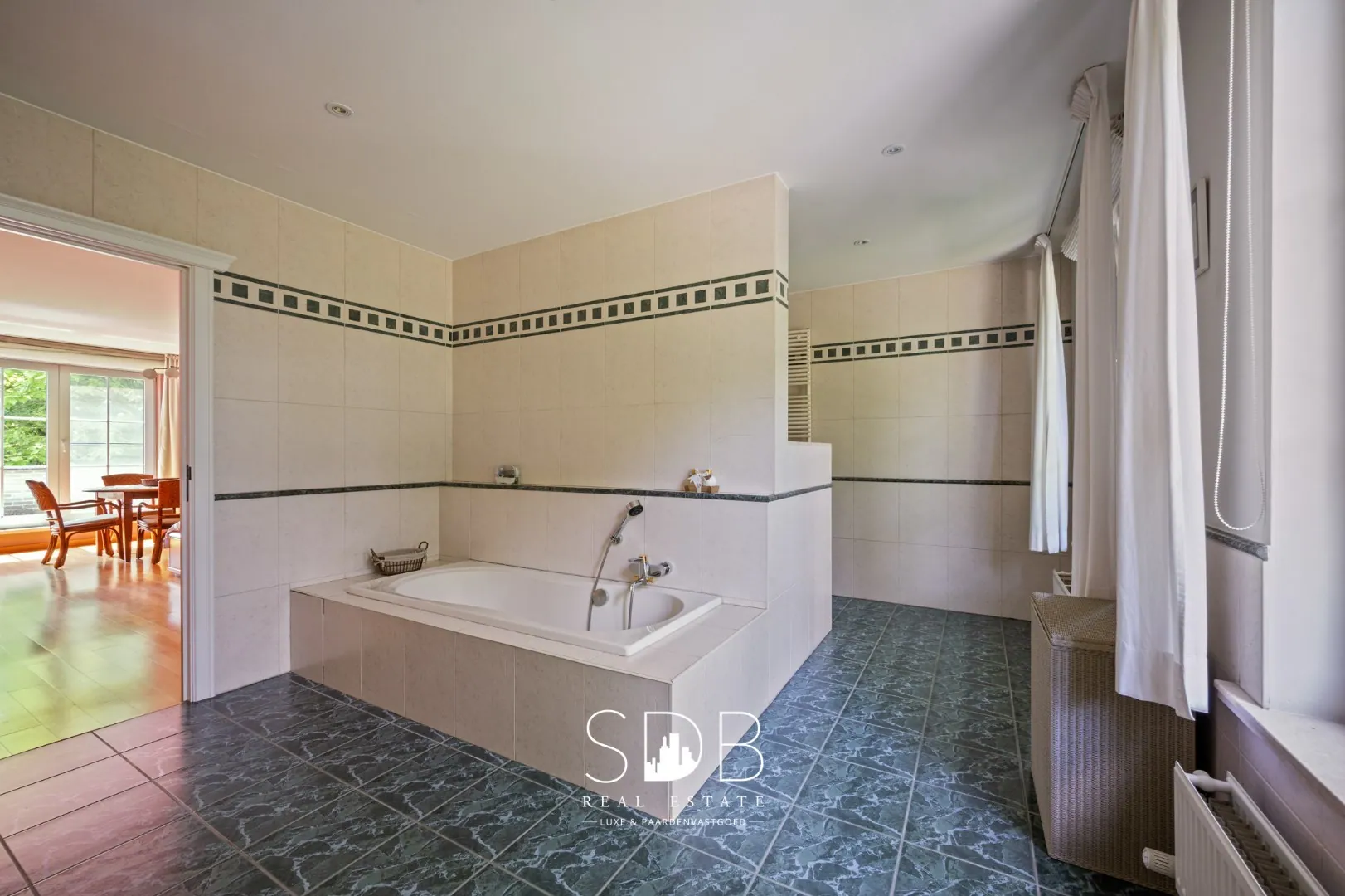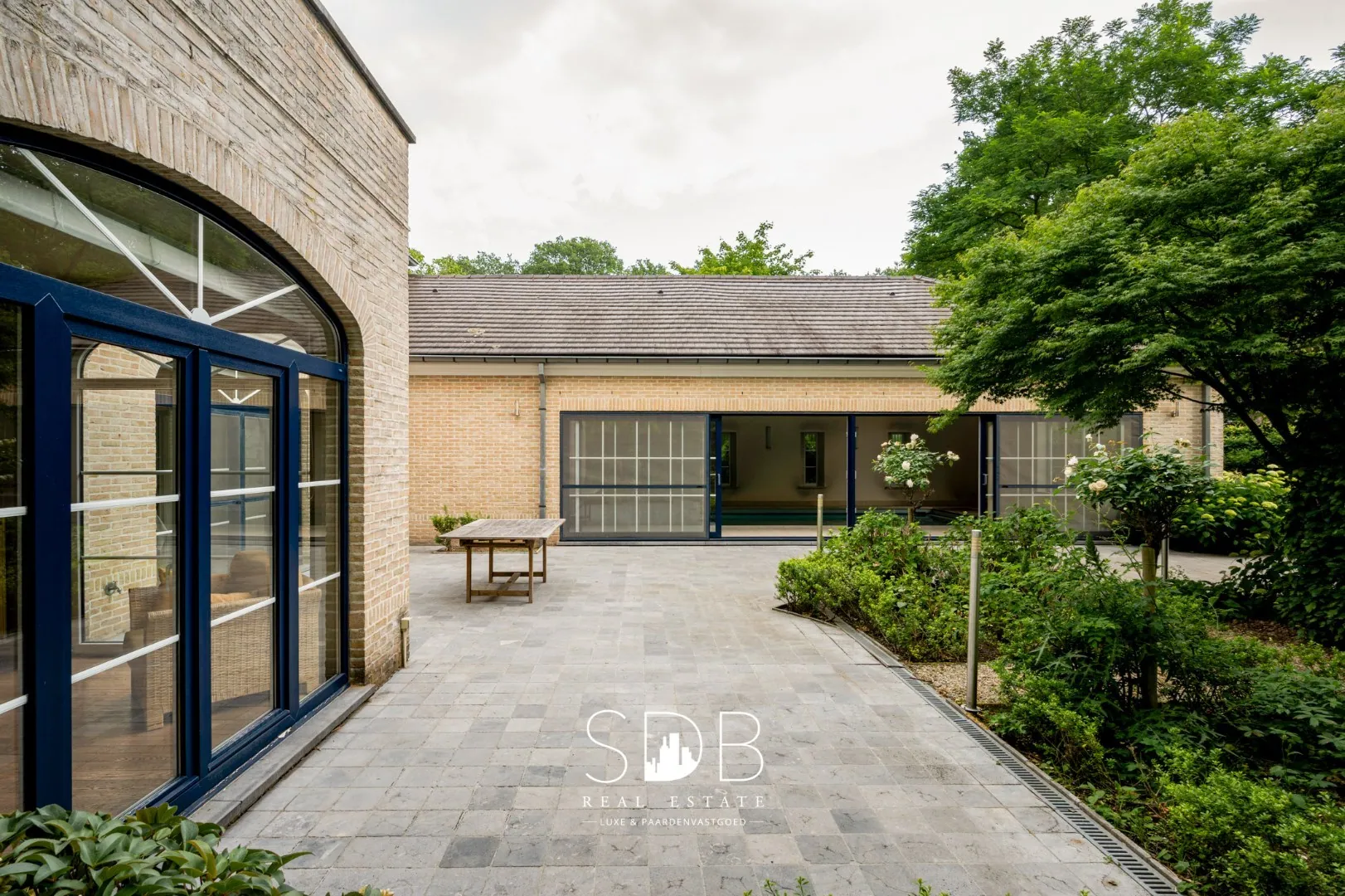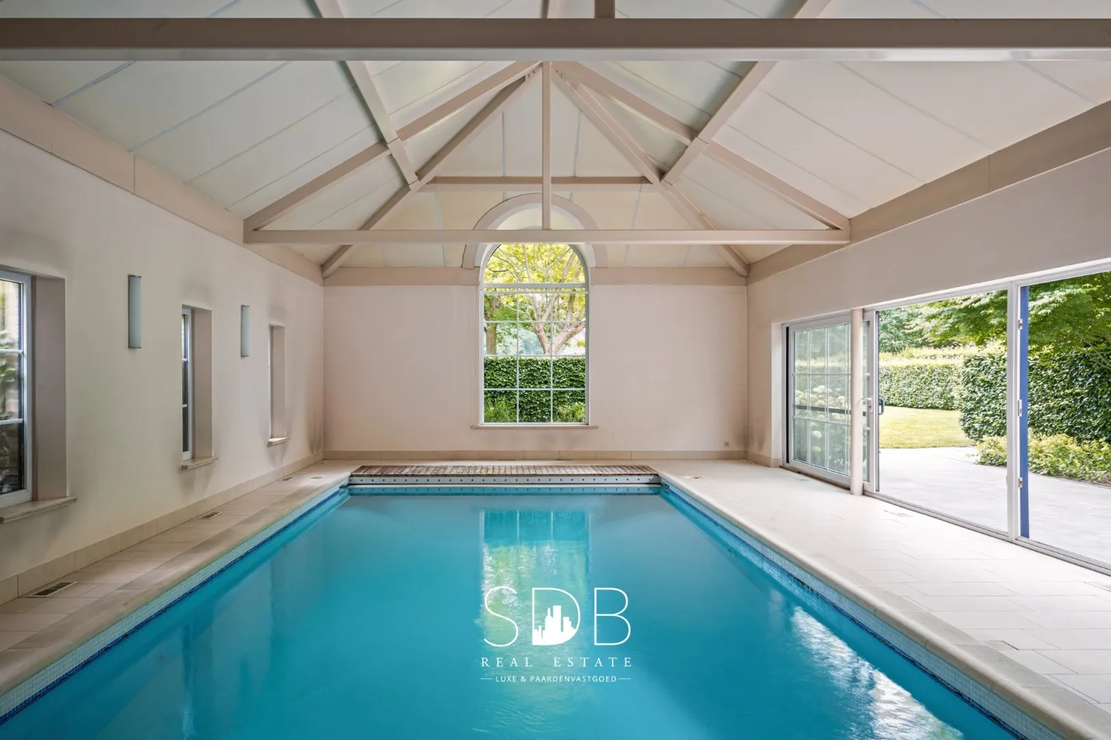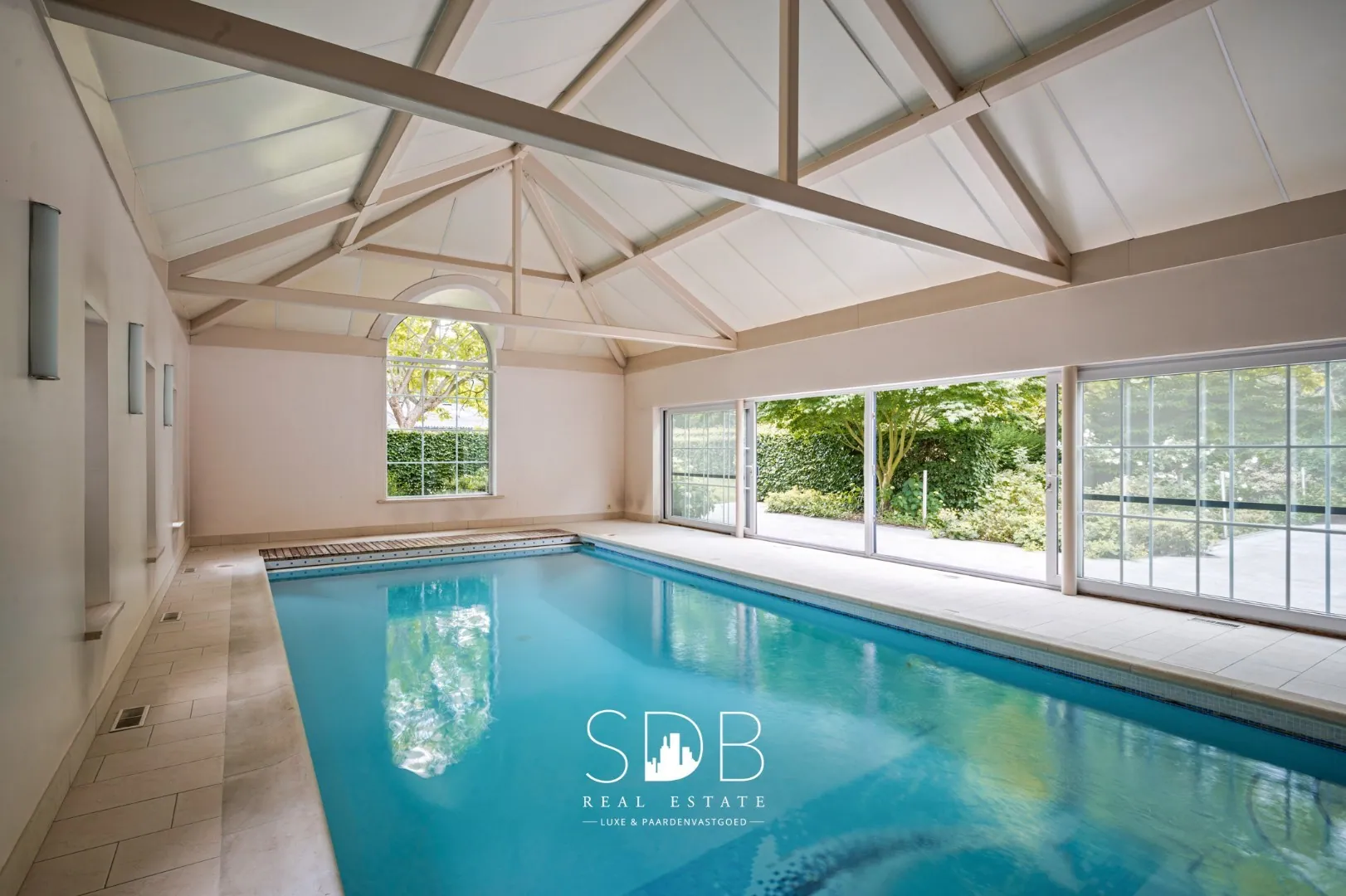 Dit prachtige landhuis beschikt ook over een exclusief binnenzwembad, de perfecte plek om te ontspannen en het hele jaar door te genieten. De raampartijen zorgen voor een lichte, open sfeer en creëren een naadloze verbinding met de buitenruimte.