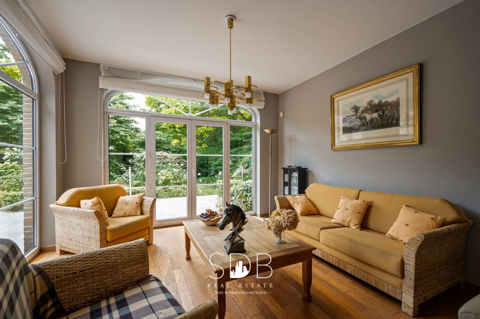De royale woonkamer is ingedeeld in een gezellige eetruimte en 2 sfeervolle zithoeken waarvan 1 rond een centraal geplaatste houthaard. Diverse raampartijen zorgen voor een overvloed aan natuurlijk daglicht.