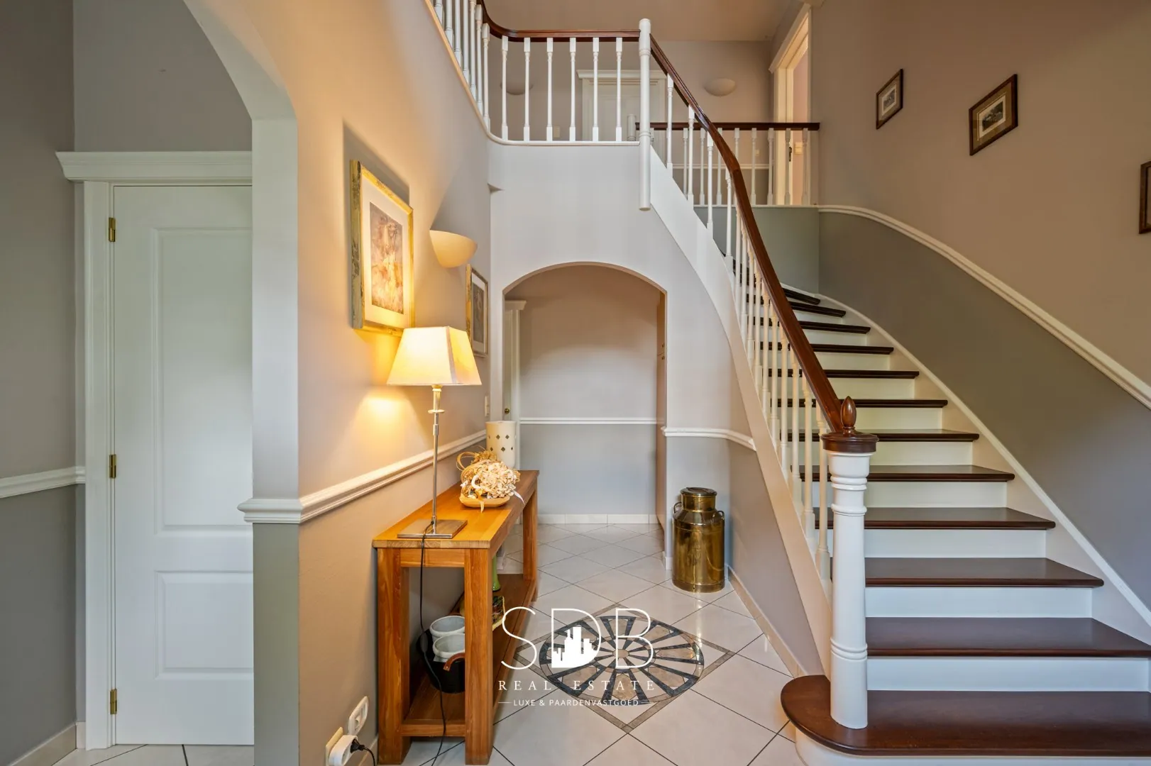 De inkomhal weerspiegelt de landelijke elegantie en het karakter van de woning. Aan de ene zijde heb je toegang tot het bureau en aan de andere zijde tot de woonkamer.