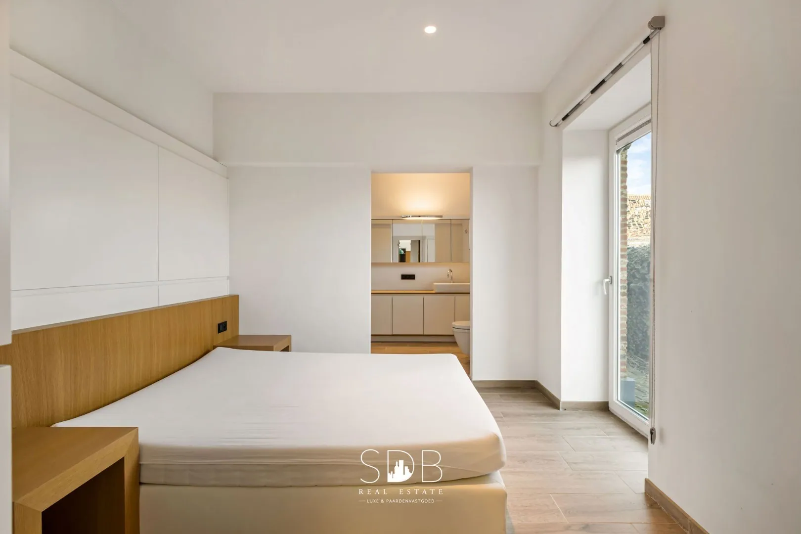 De 1ste slaapkamer met een tijdloze sfeer beschikt over een aanpalende badkamer die is uitgerust met een enkel lavabomeubel, inloopdouche en een toilet.