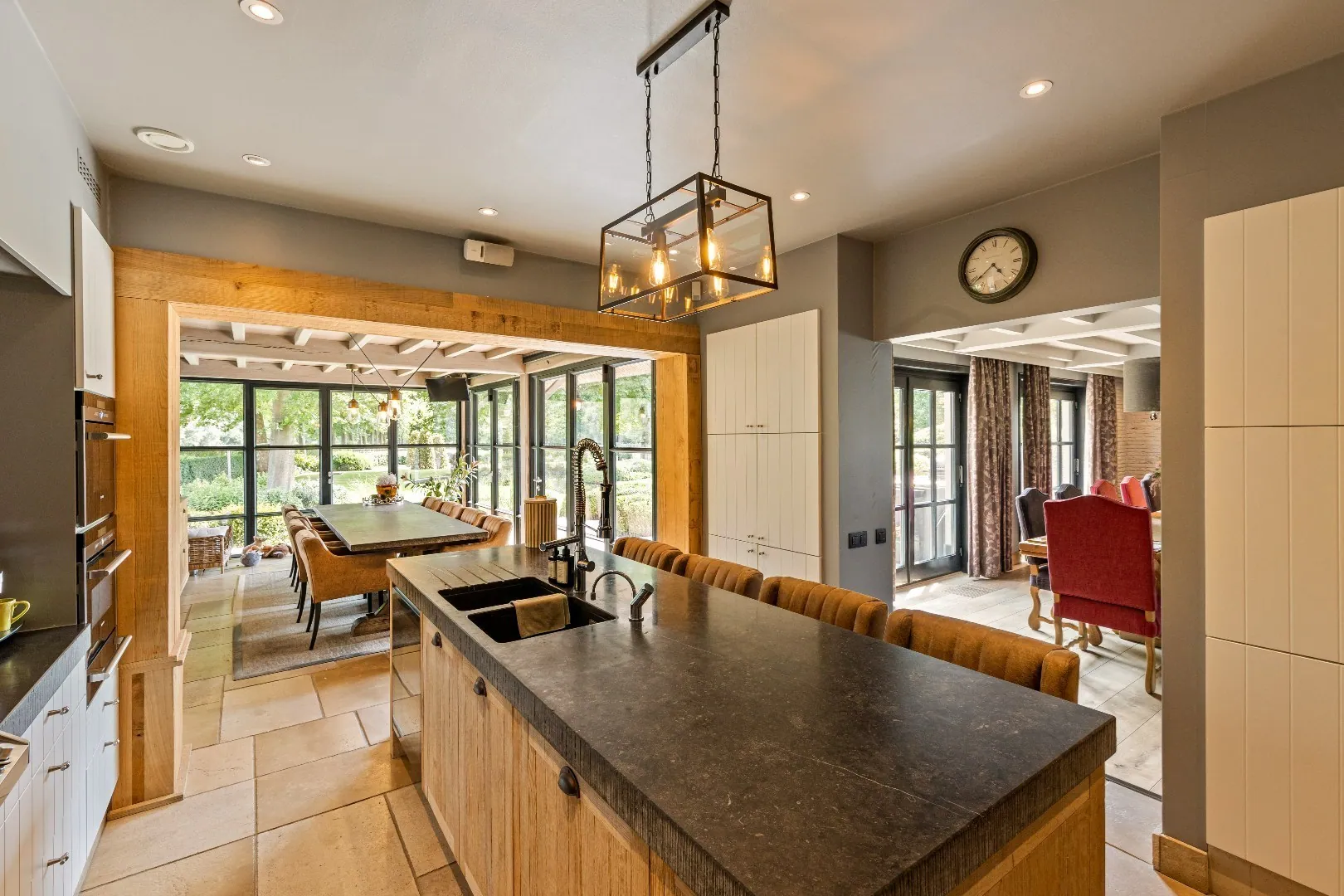 Aansluitend vind je de riante veranda in dezelfde elegante stijl die geniet van heel veel natuurlijk daglicht dankzij de grote raampartijen, die mede volledig kunnen openschuiven. Met een open zicht op de tuin.