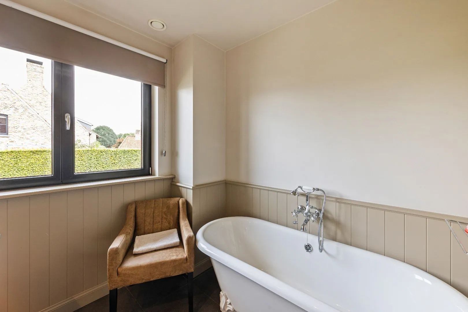 De eiken parketvloer, de ingebouwde eiken kasten, de houten plafondstructuren en de elegante open haard zorgen voor tijdloze charme en een rustgevende sfeer.