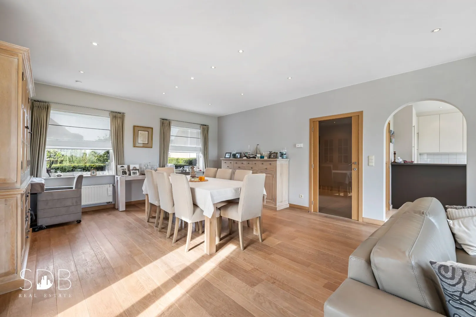 Deze gehele leefruimte geniet van een gezonde portie natuurlijk daglicht door de open raampartijen.