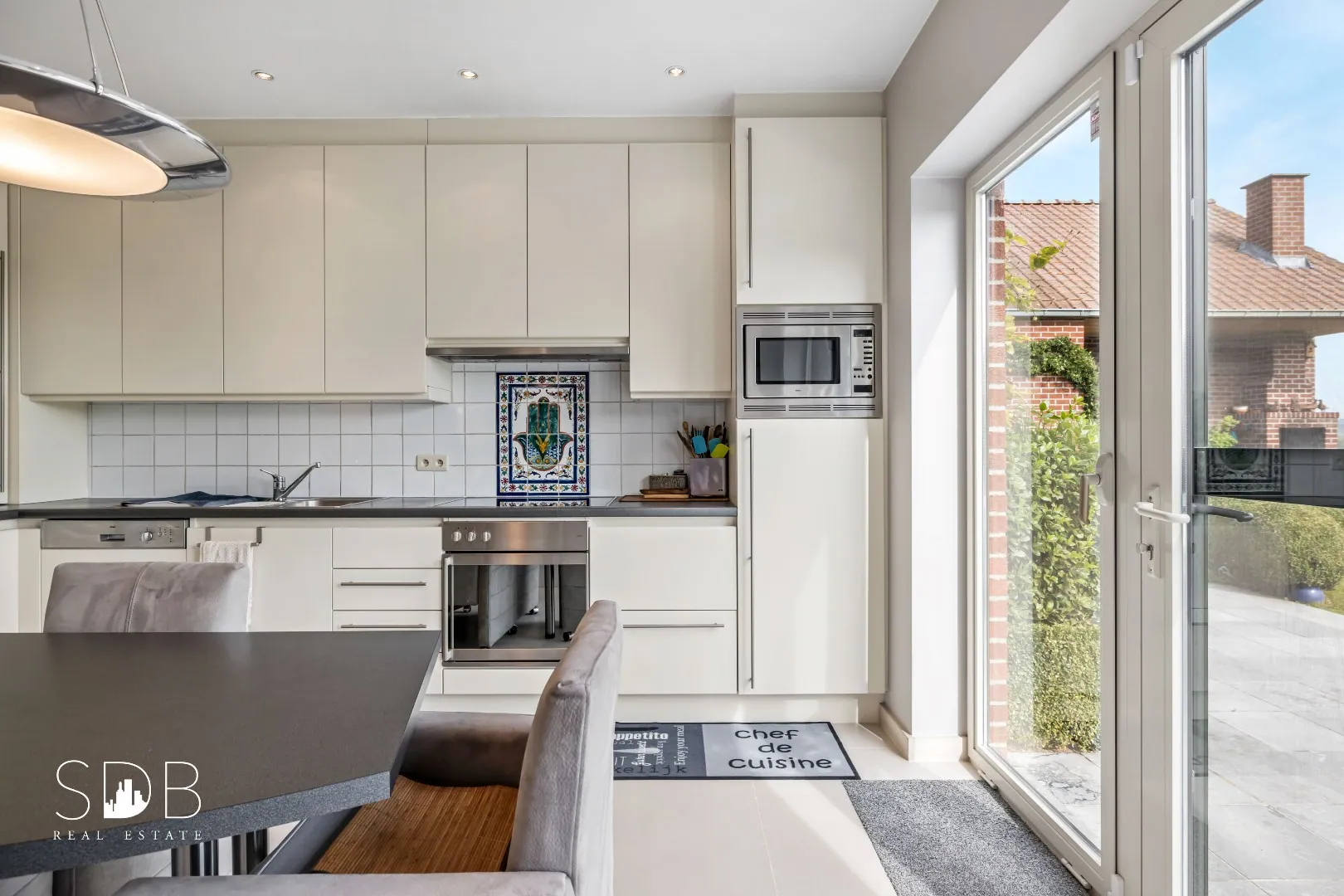 Daarnaast zorgt de aanwezigheid van de grote glaspartij incl. deur voor een aangenaam woonklimaat, welke uitgeeft op het terras. Steeds het zonnetje in huis.