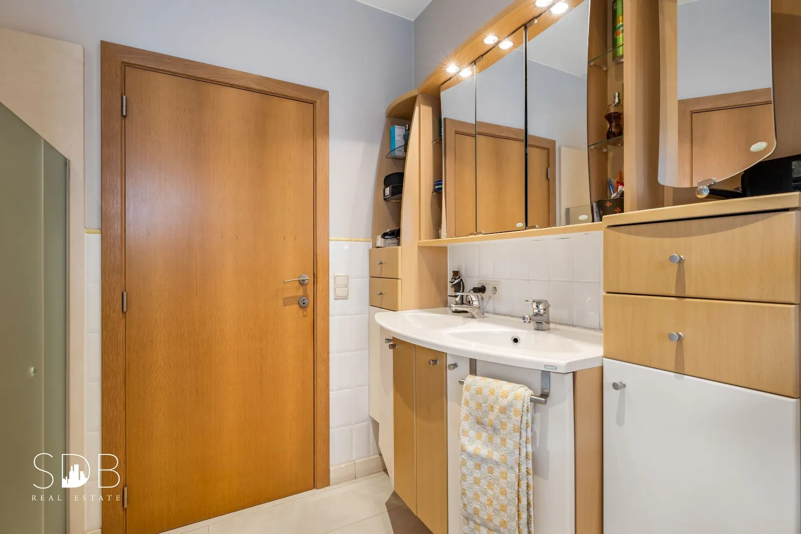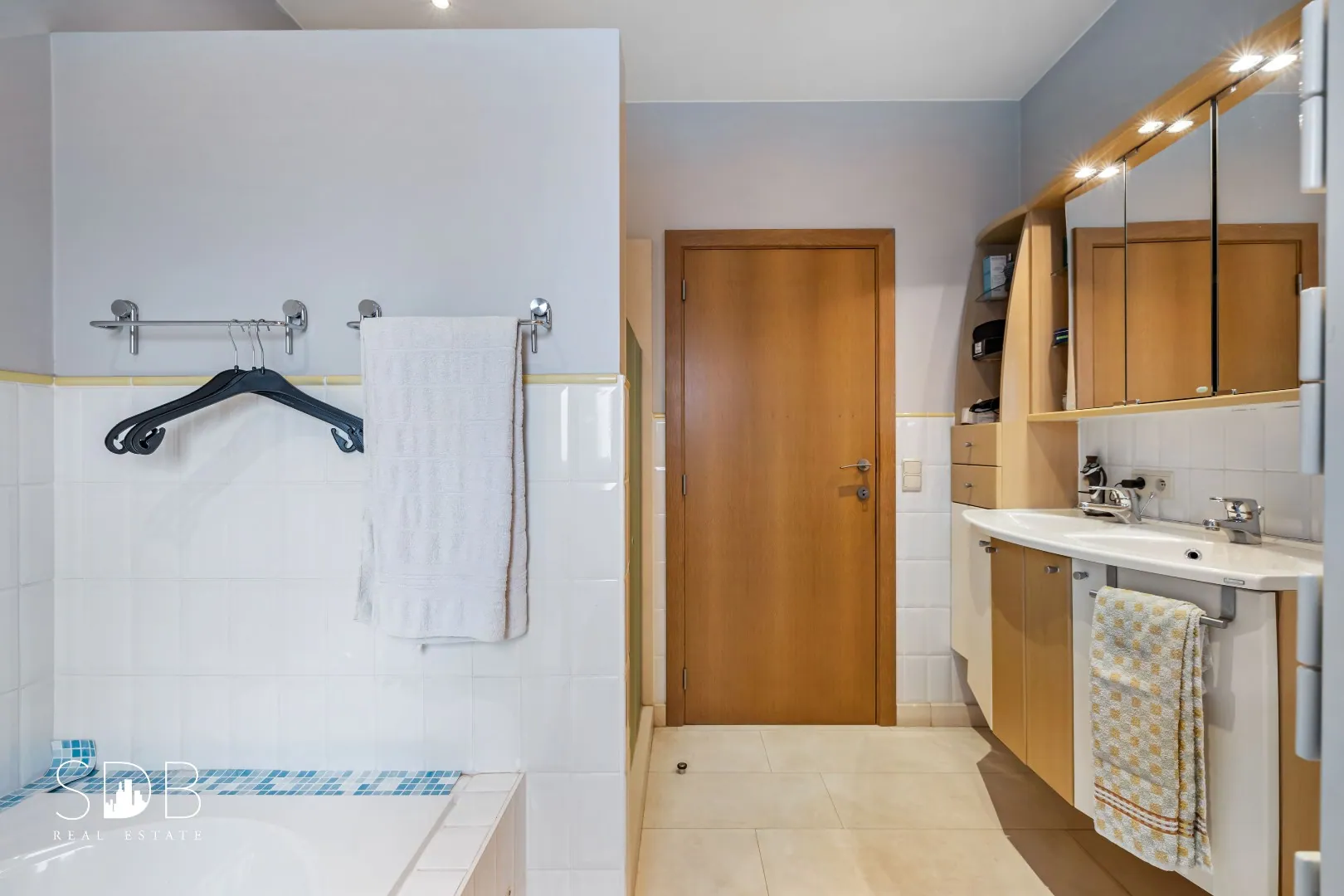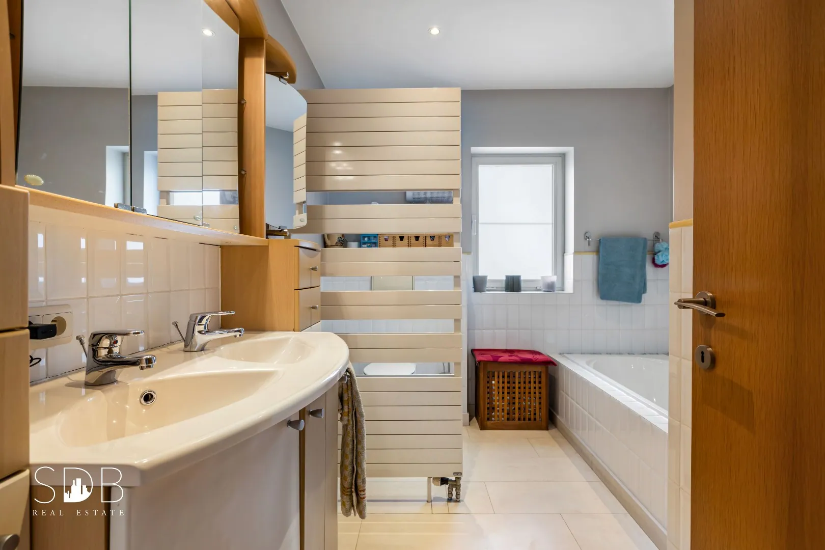 De badkamer op het gelijkvloers beschikt over een dubbel lavabomeubel, ligbad, douche en toilet.