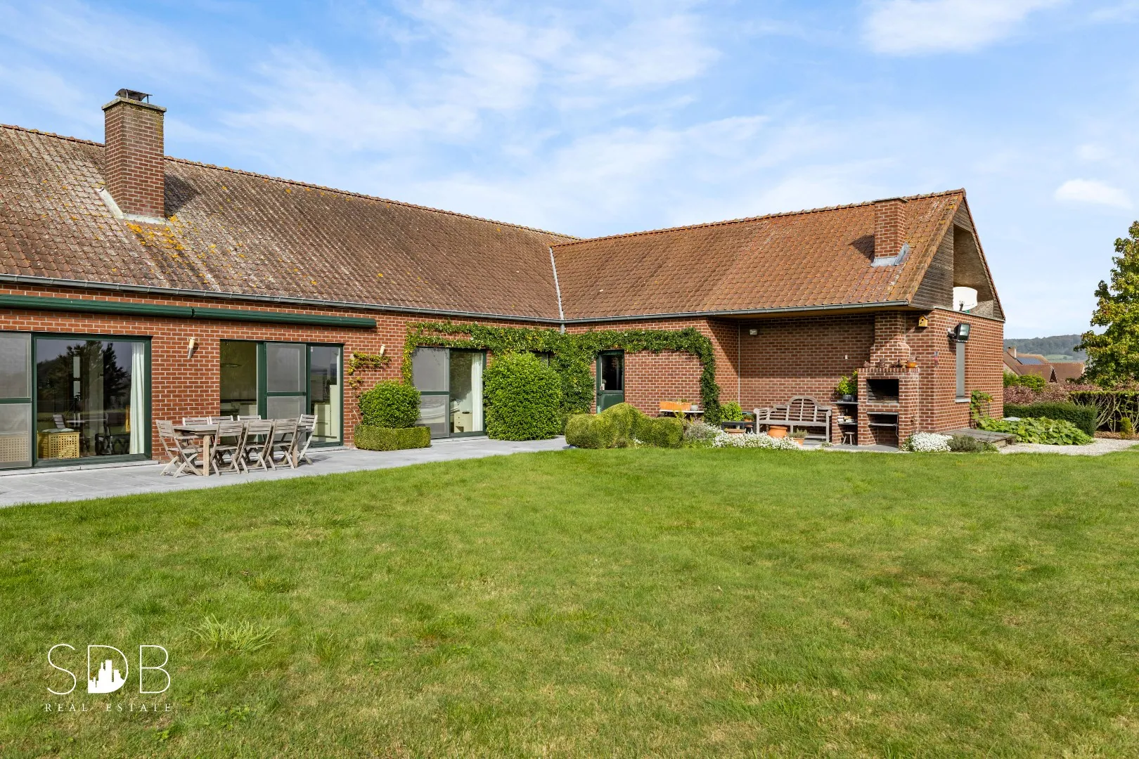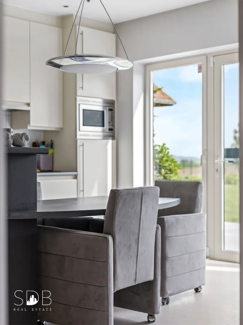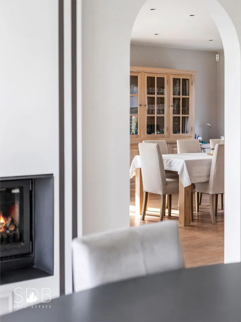 Aanpalend tref je de hedendaagse keuken aan, voorzien in al haar faciliteiten. Gezelligheid troef met de ingebouwde openhaard.