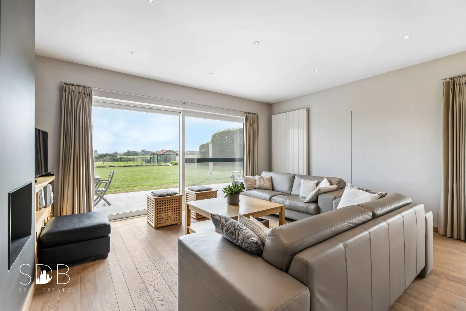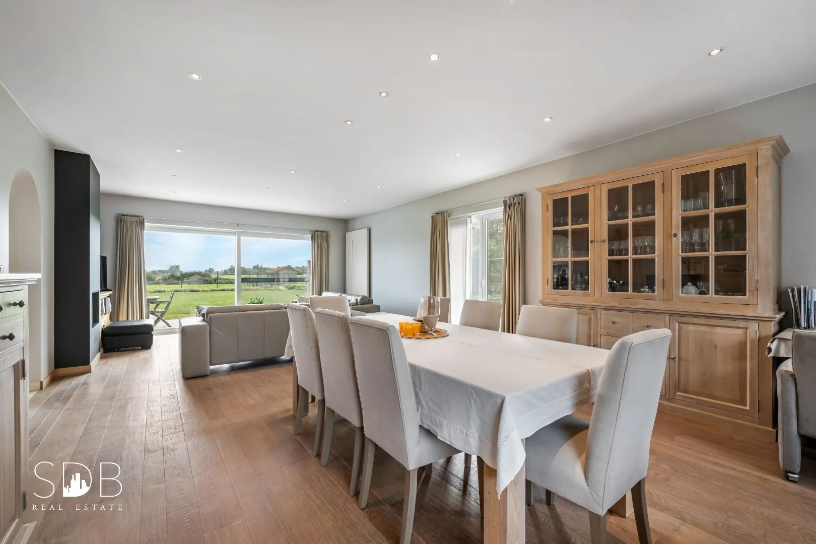 De royale leefruimte is opgedeeld in een gezellige zithoek, uitkijkend op de tuin met aansluitend de eetruimte.