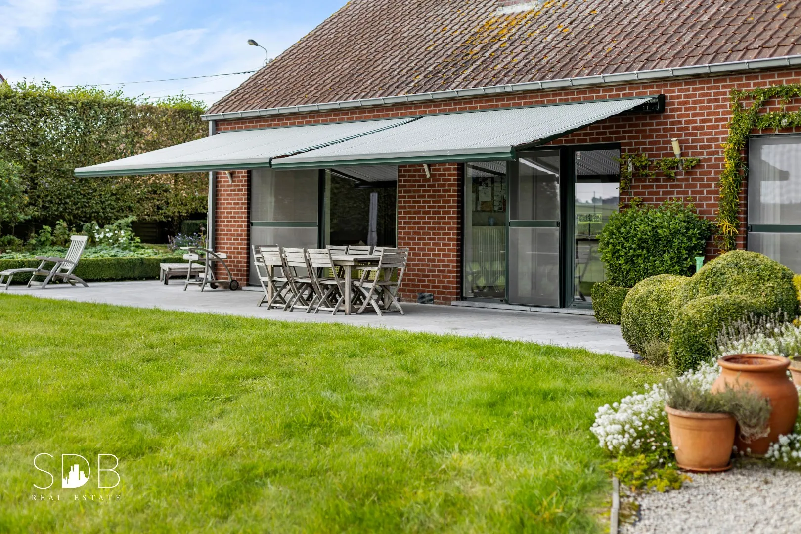Buitenshuis zijn we omringd door de groene omgeving. Een prachtige aangelegde tuin met een gezellig terras voorzien van zonneluifels.