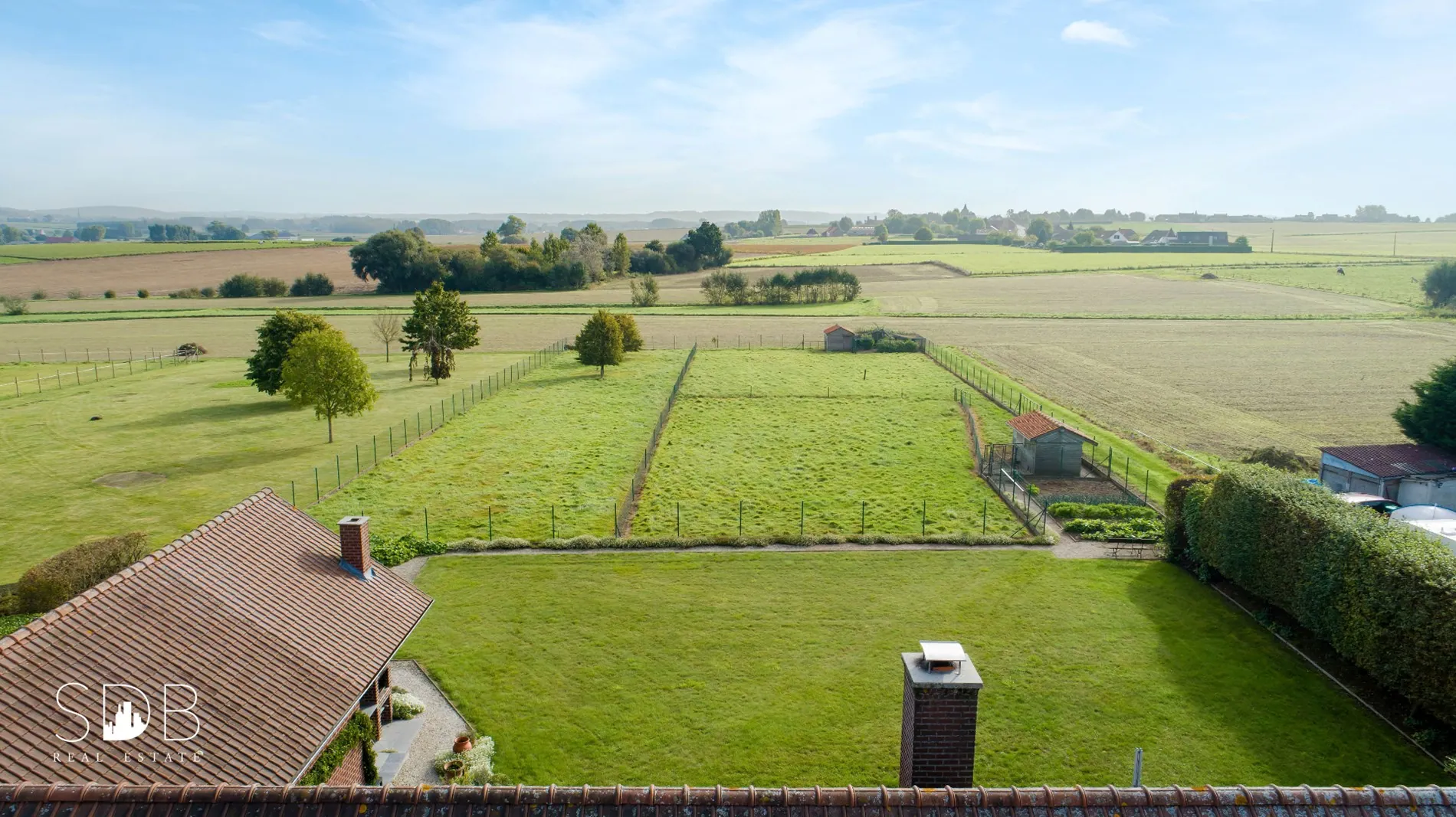 Aanpalend tref je de bijhorende graslanden aan. Welke is voorzien van een stallen.