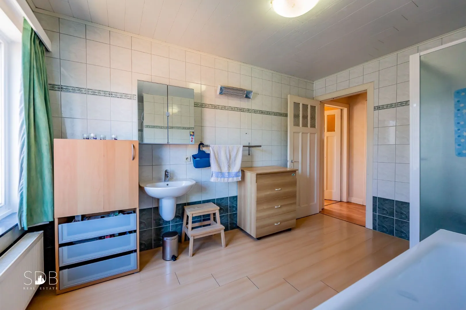 Alsook tref je hier een 2de badkamer aan ingericht met een enkel lavabomeubel, een ligbad, een douche en een toilet.