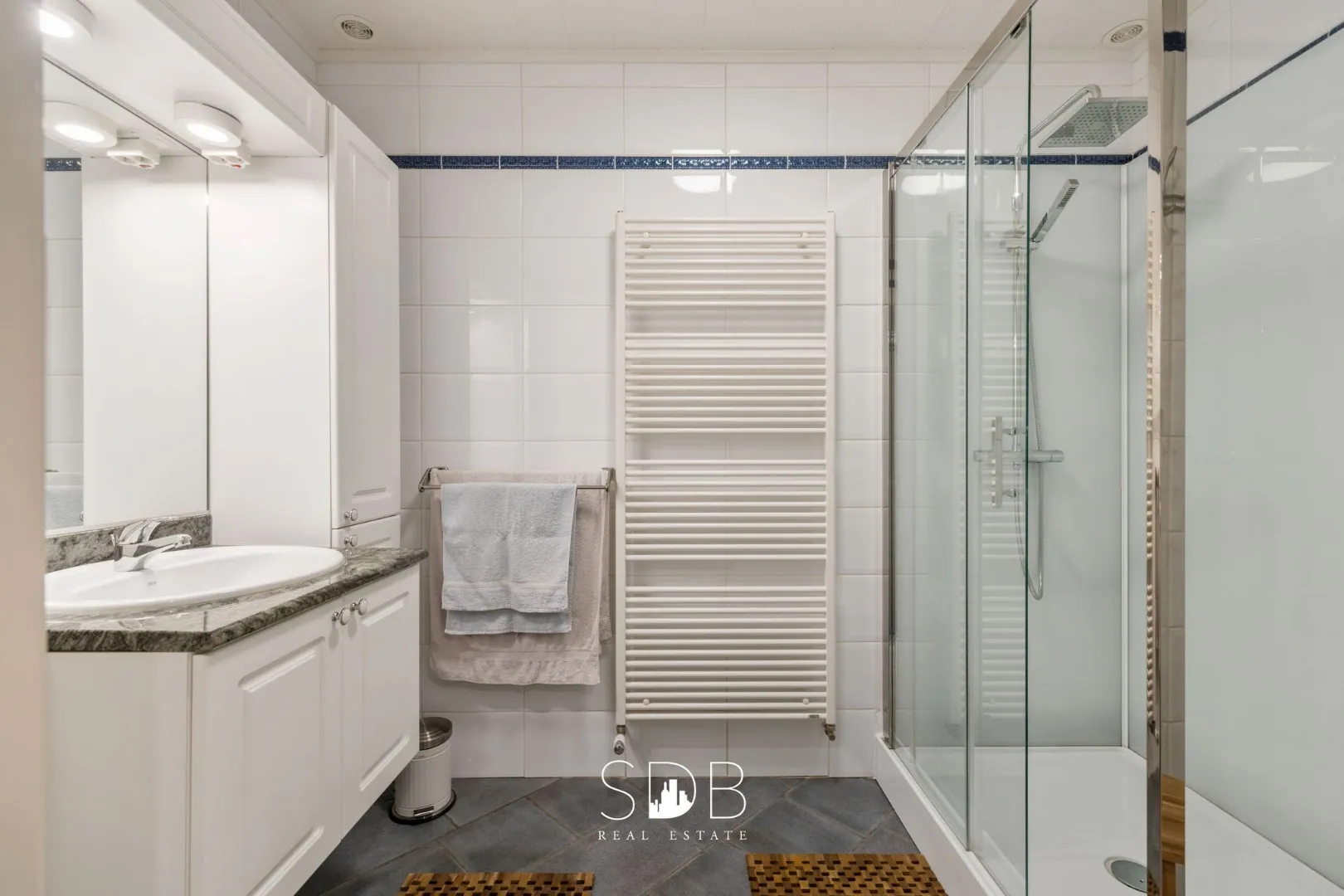 Ook 1 van de badkamers bevindt zich op de benedenverdieping. Deze tijdloze badkamer is uitgerust met een enkel lavabomeubel, een ruime douche en een toilet.