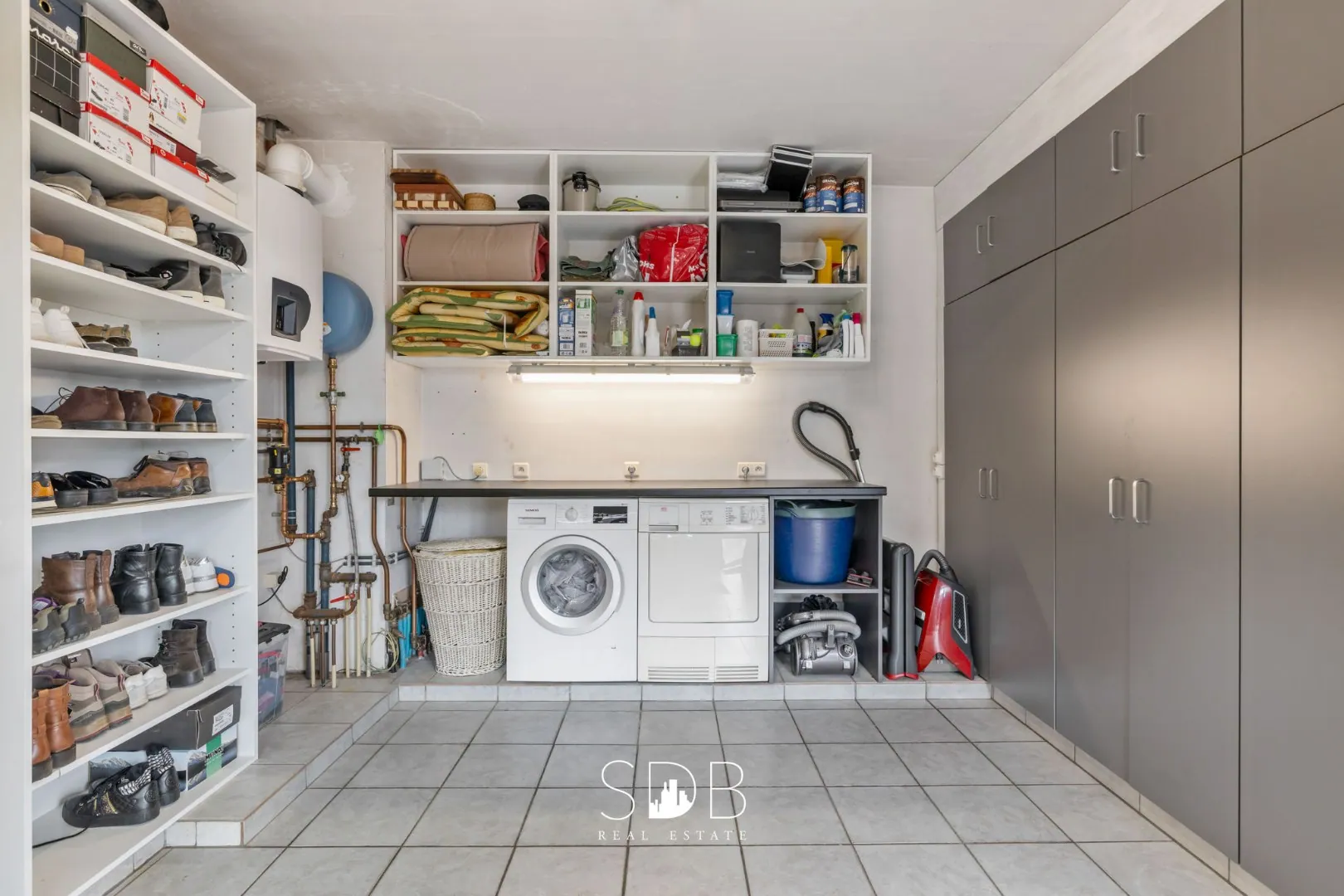 Eveneens treffen we op het gelijkvloers de berging aan, welke zich bevindt tussen de garage en het atelier. Deze ruimte is voorzien van de nodige aansluitingen voor droogkast en wasmachine. De aanwezige inbouwkasten maken het praktisch gegeven af.