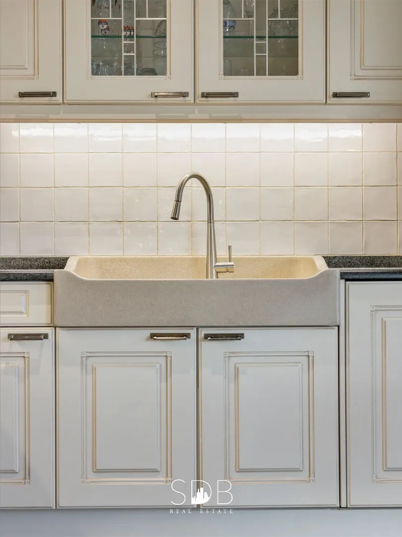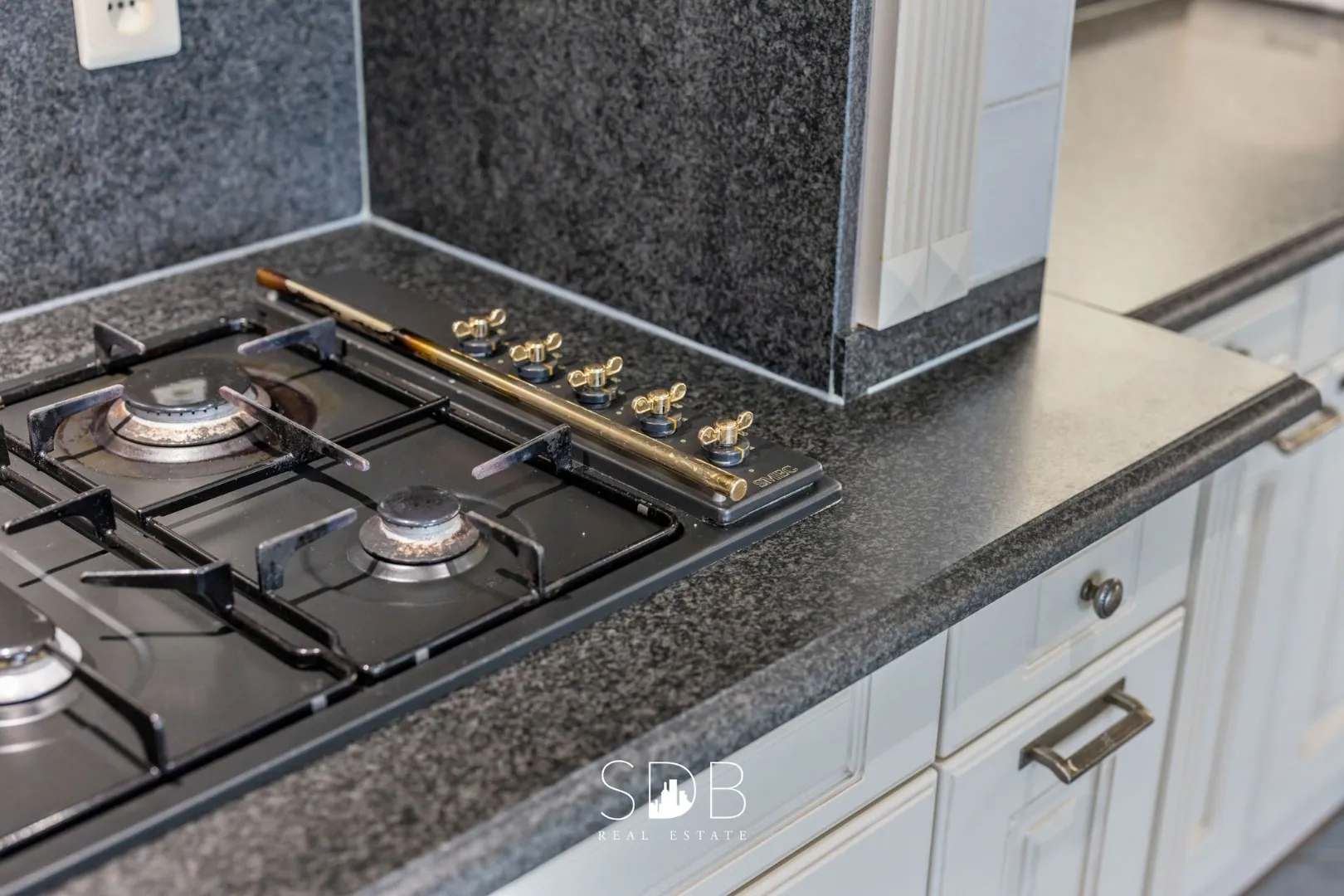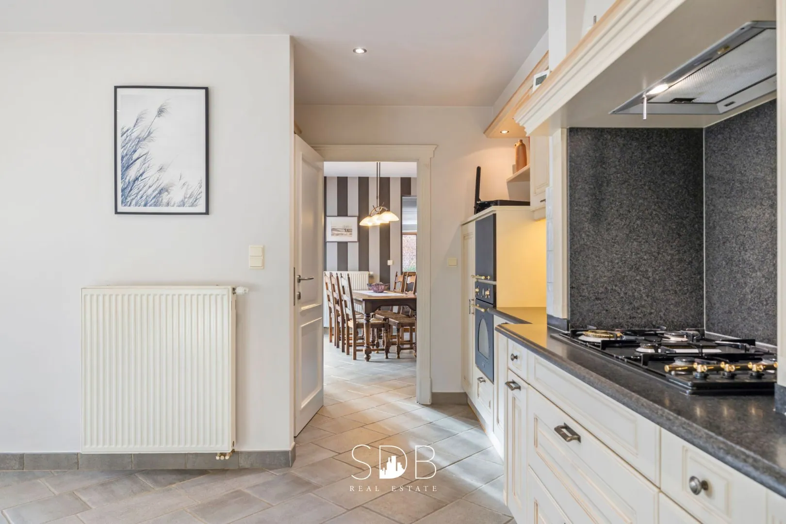 De prachtige landelijk ingerichte keuken is voorzien in al haar faciliteiten. De open raampartijen zorgen voor natuurlijk daglicht en verlichten de hele ruimte, waardoor een heldere en uitnodigende sfeer ontstaat.
