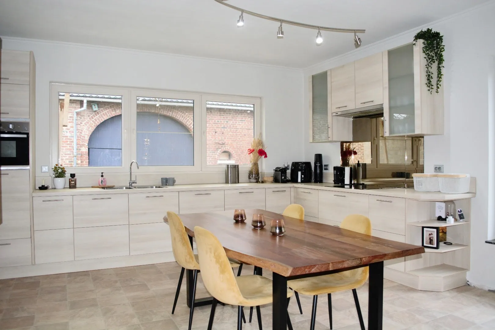 De inkom leidt ons naar de ruime hedendaagse keuken met een rustig maar strak interieur die voorzien is in al haar faciliteiten en uitkijkt op de pittoreske binnenkoer. In deze keuken is het heerlijk vertoeven, mede door de aanwezigheid van een gezellige zithoek.