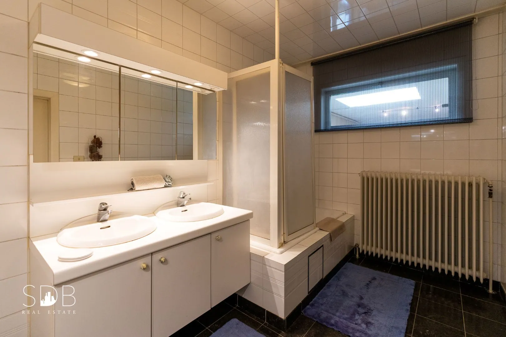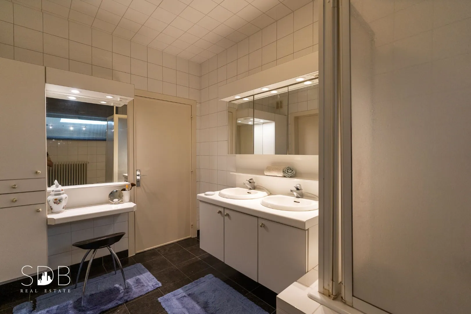 De huidige badkamer is ingericht met een dubbel lavabomeubel, een ligbad incl. douche en een make-up hoekje als leuke aanvulling.