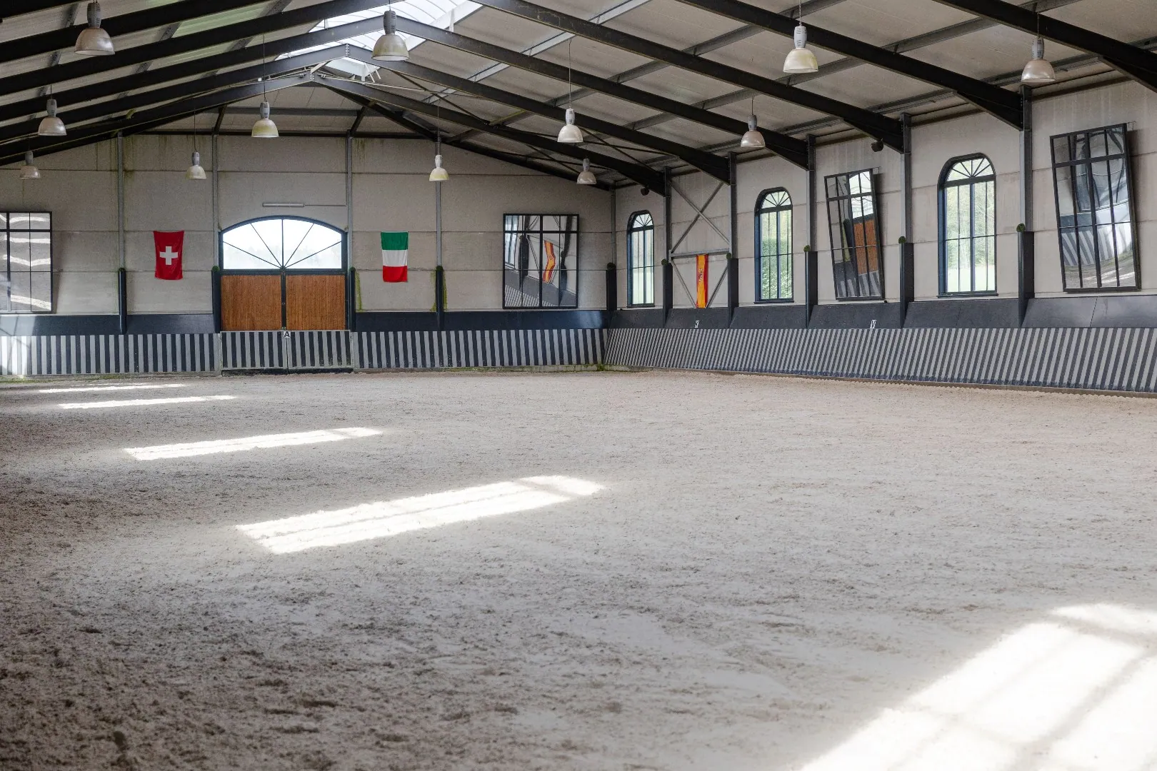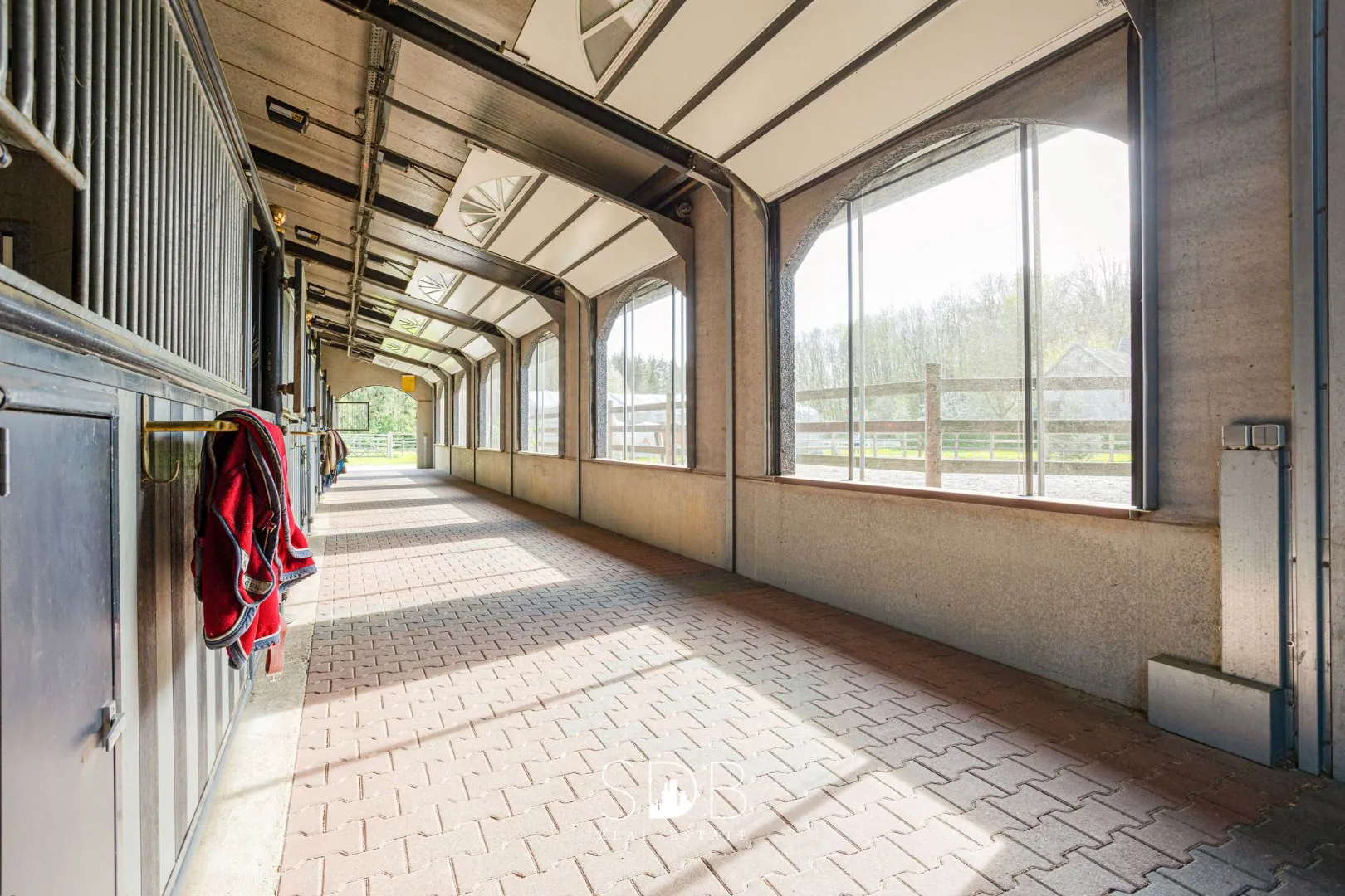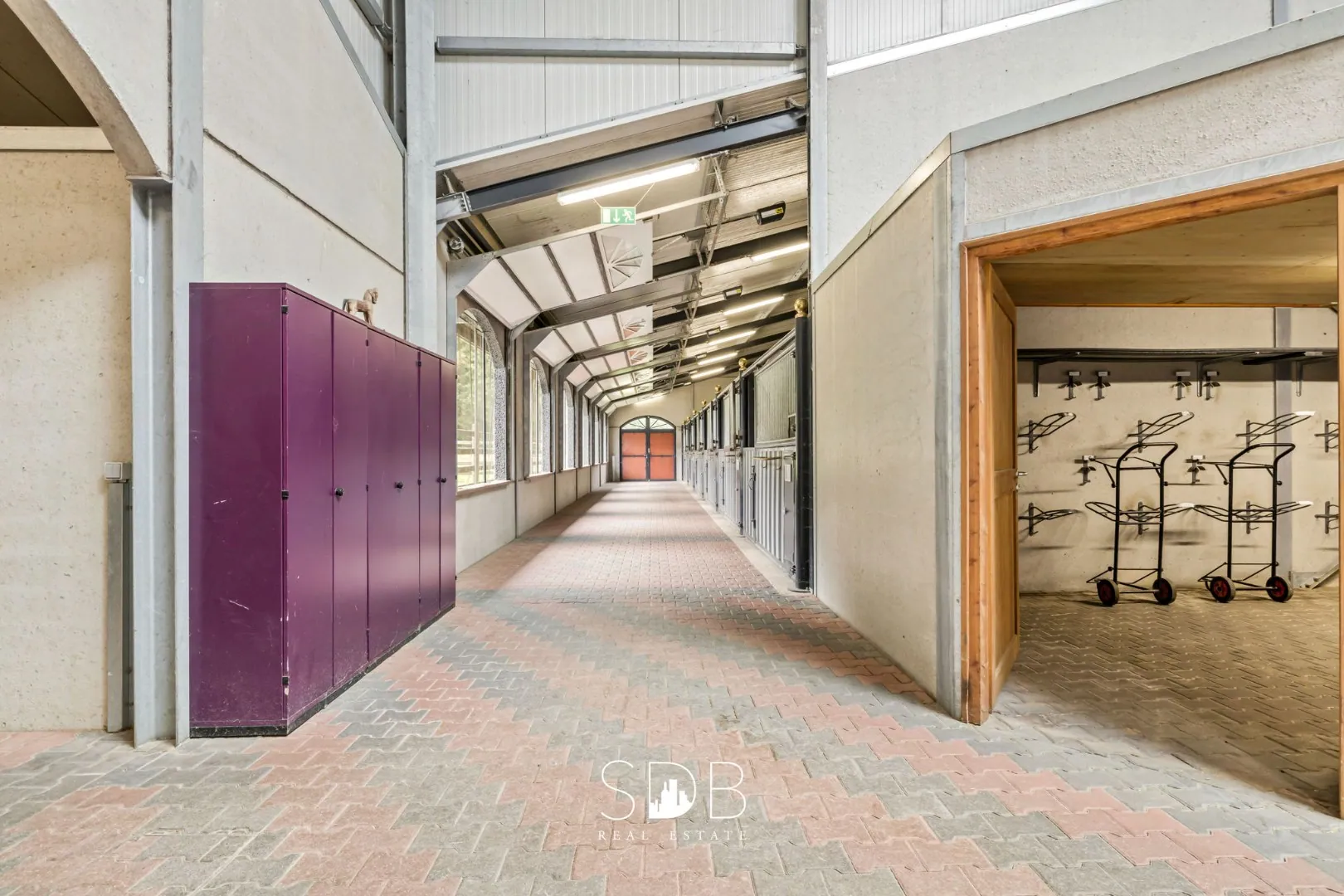 De sportaccommodatie beschikt over een centraal punt, een open hal, welke ons wegwijs maakt naar enerzijds de binnenpiste, anderzijds de 24 stallen die verdeeld zijn over 2 gangen en 1 gang die uitgerust is met meerdere poetsplaatsen, solarium, een quarantaine box, 2 afzonderlijke smeedruimtes en verschillende zadelkamers.