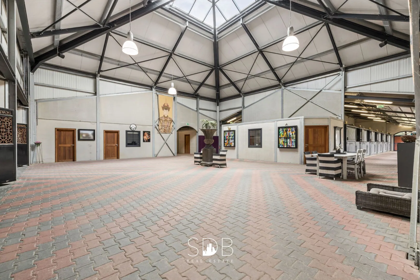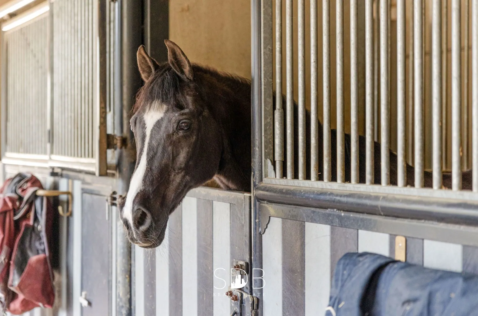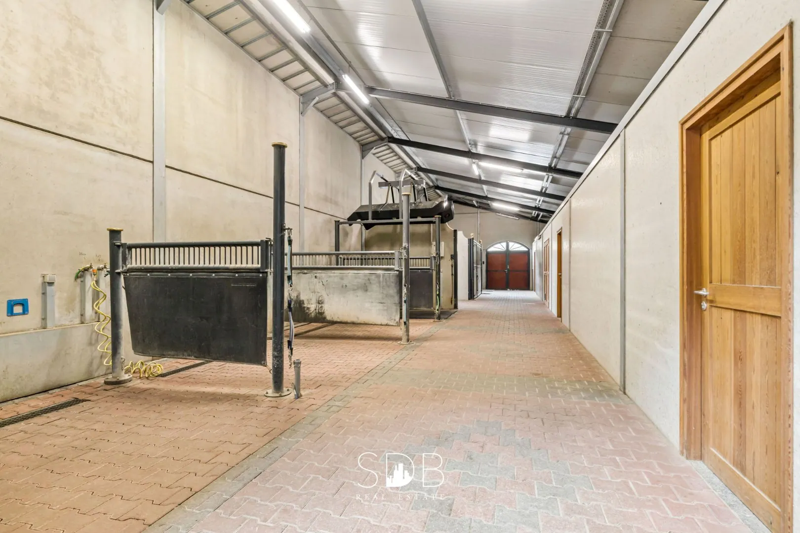 De sportaccommodatie beschikt over een centraal punt, een open hal, welke ons wegwijs maakt naar enerzijds de binnenpiste, anderzijds de 24 stallen die verdeeld zijn over 2 gangen en 1 gang die uitgerust is met meerdere poetsplaatsen, solarium, een quarantaine box, 2 afzonderlijke smeedruimtes en verschillende zadelkamers.