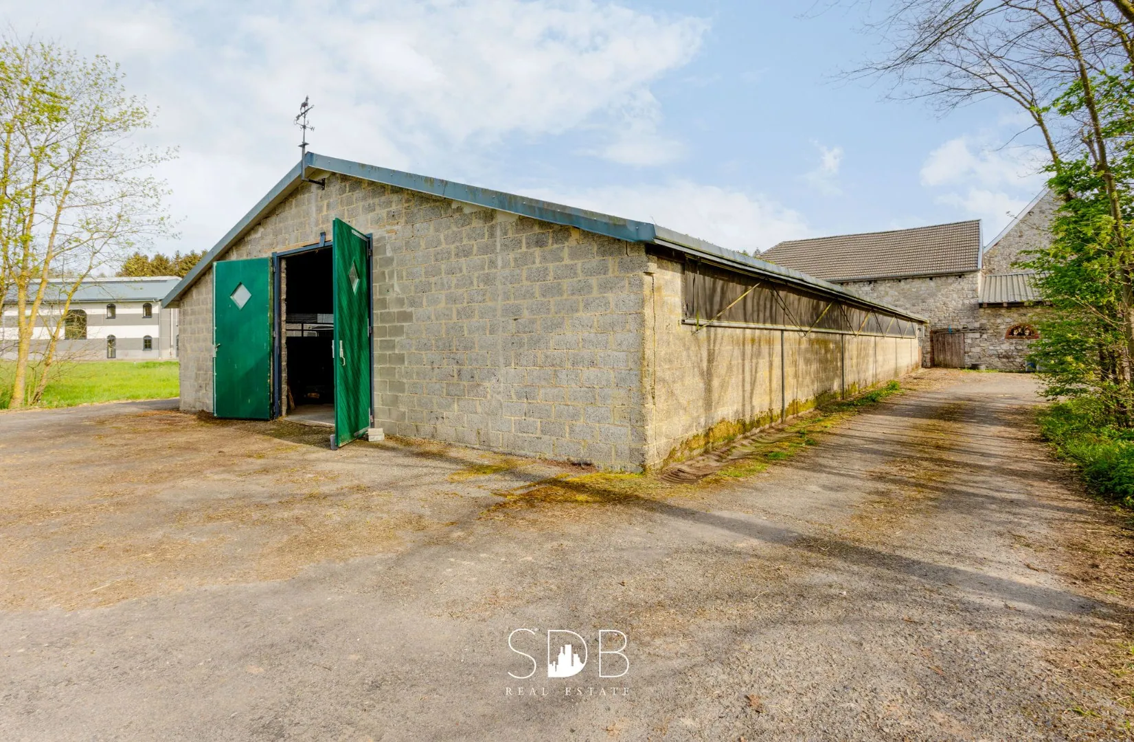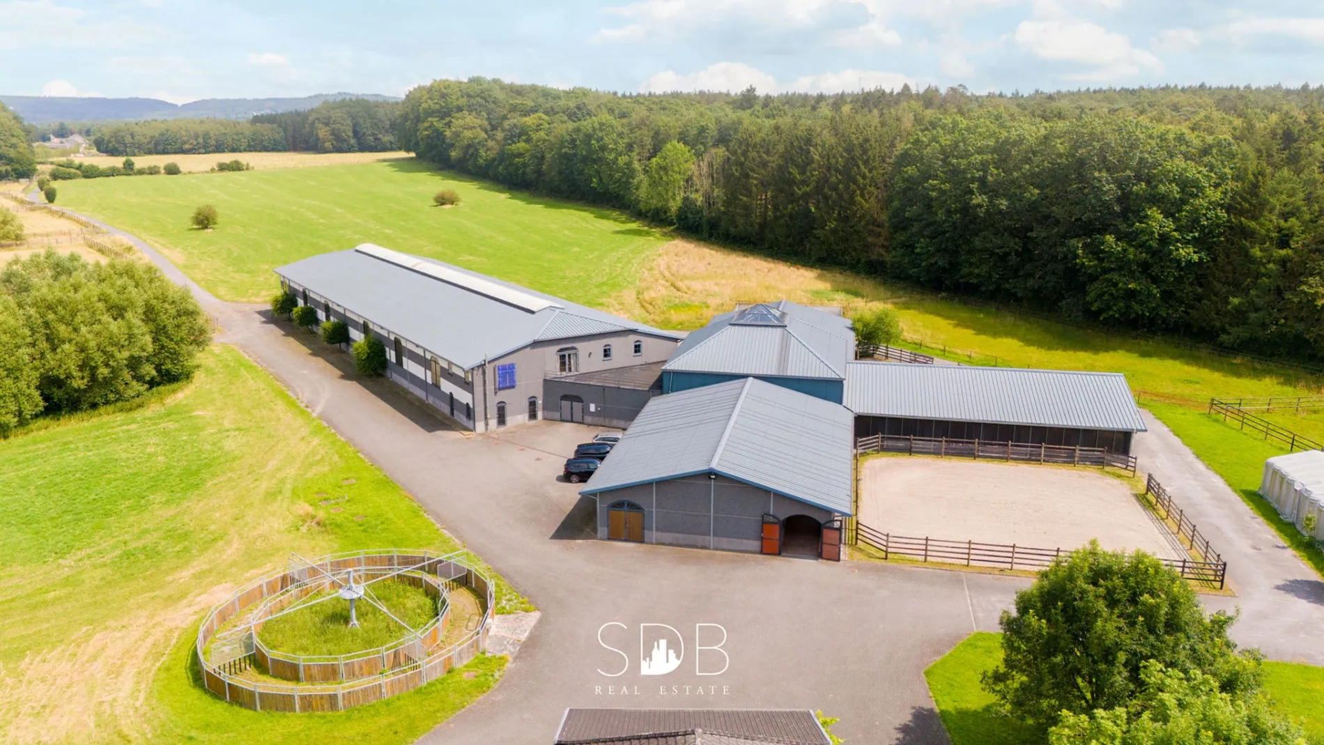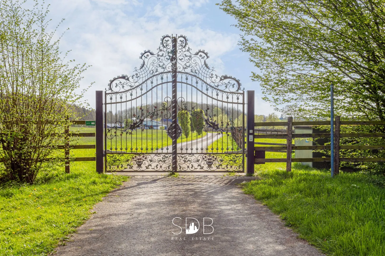 De private oprit begeleid ons doorheen de eigendom naar het sportcomplex, de aanpalende woning, diverse woongelegenheden en aanhorigheden.