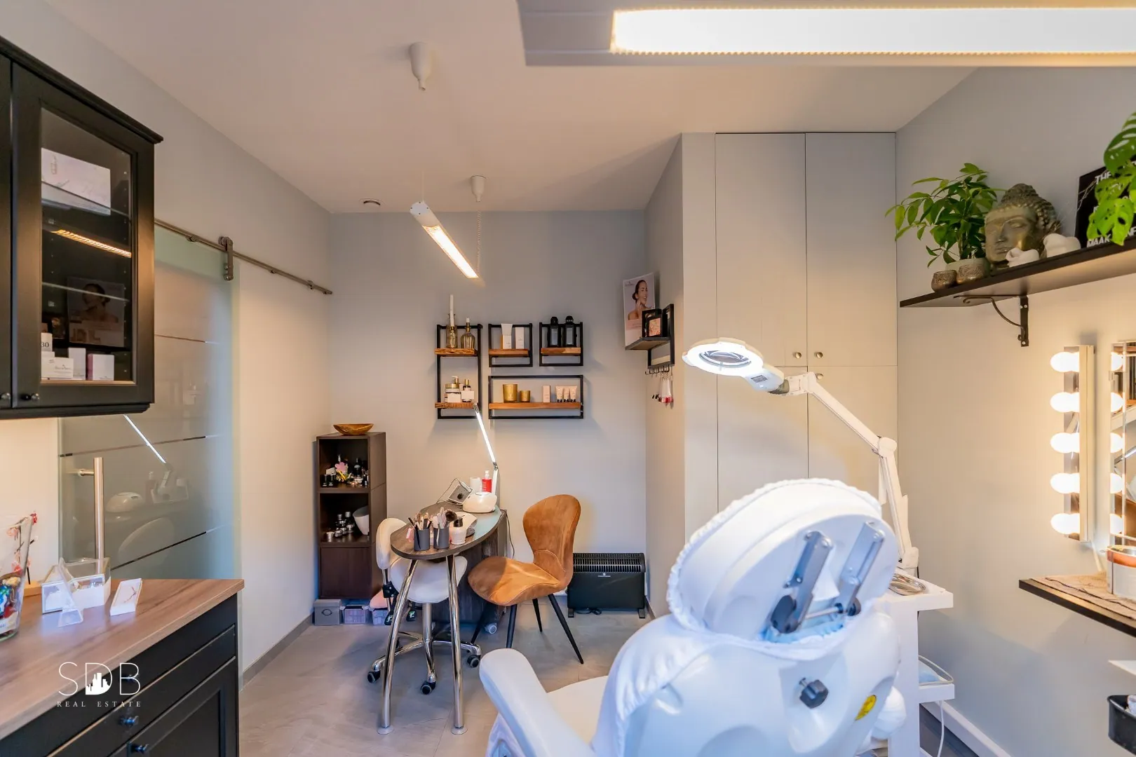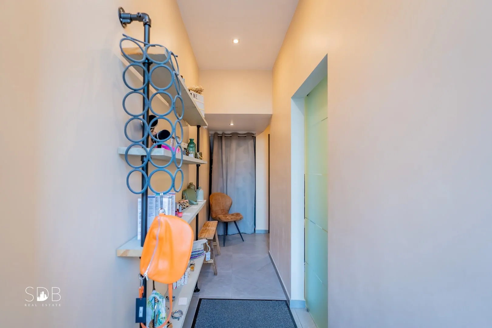 Achter de voordeur bevindt zich momenteel een privé- en werkgedeelte waarvan de doorgang naar het salon zich rechts begeeft en de privé vertrekken zich achteraan de woning begeven.