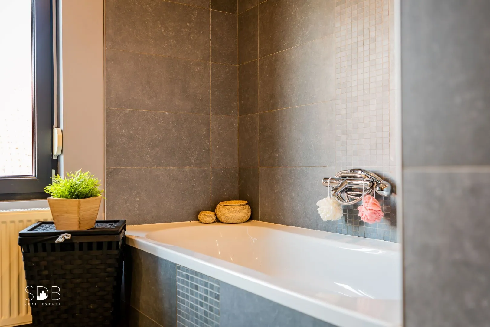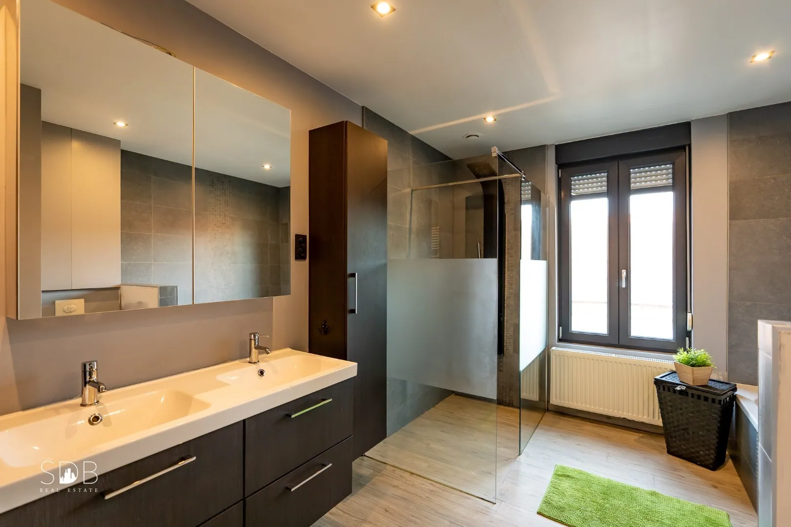 De stijlvolle badkamer is uitgerust met een dubbel lavabomeubel, een douche, een ligbad en een toilet. Deze stijl met speelse elementen straalt rust en warmte uit voor een zachte ontspannen sfeer.
