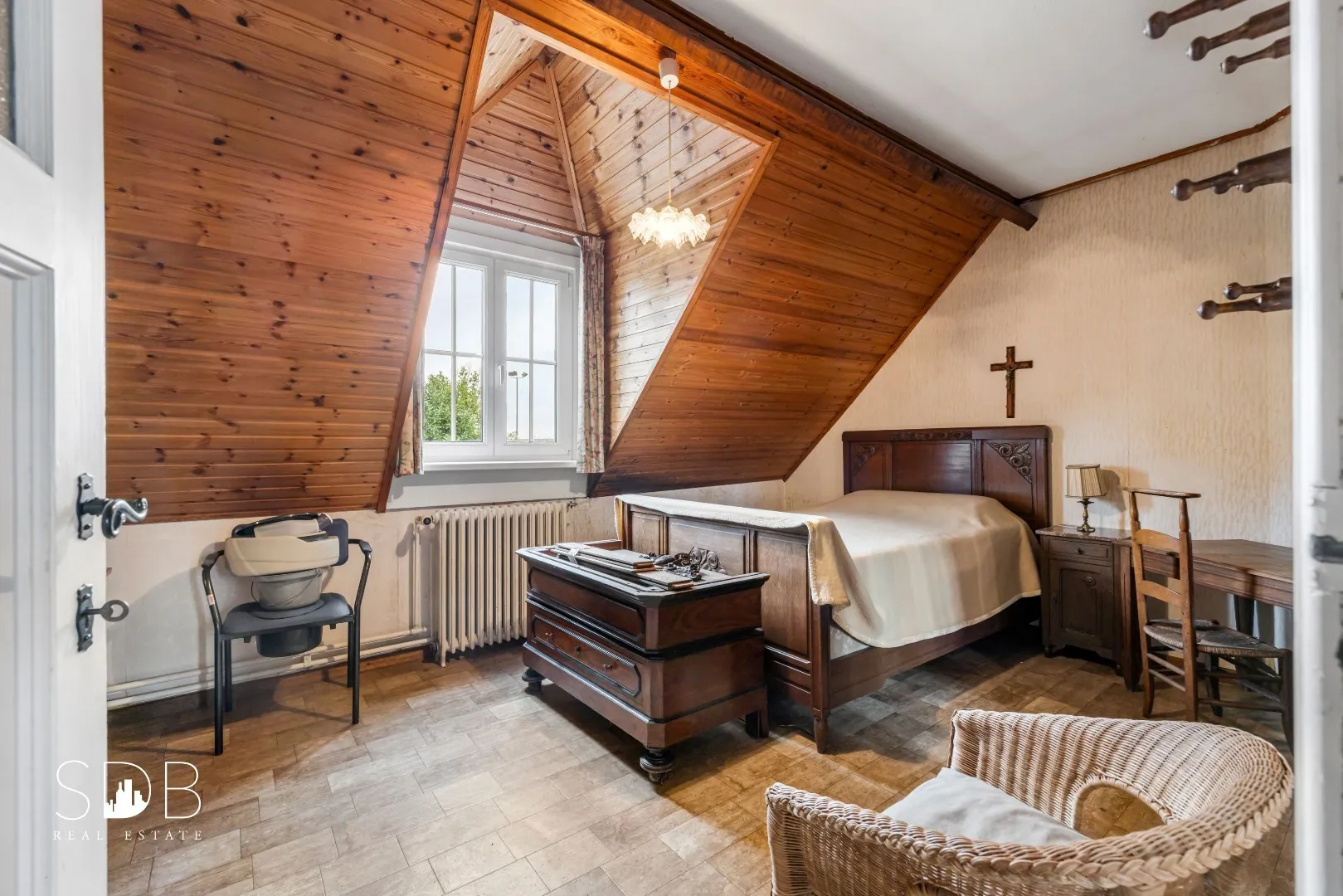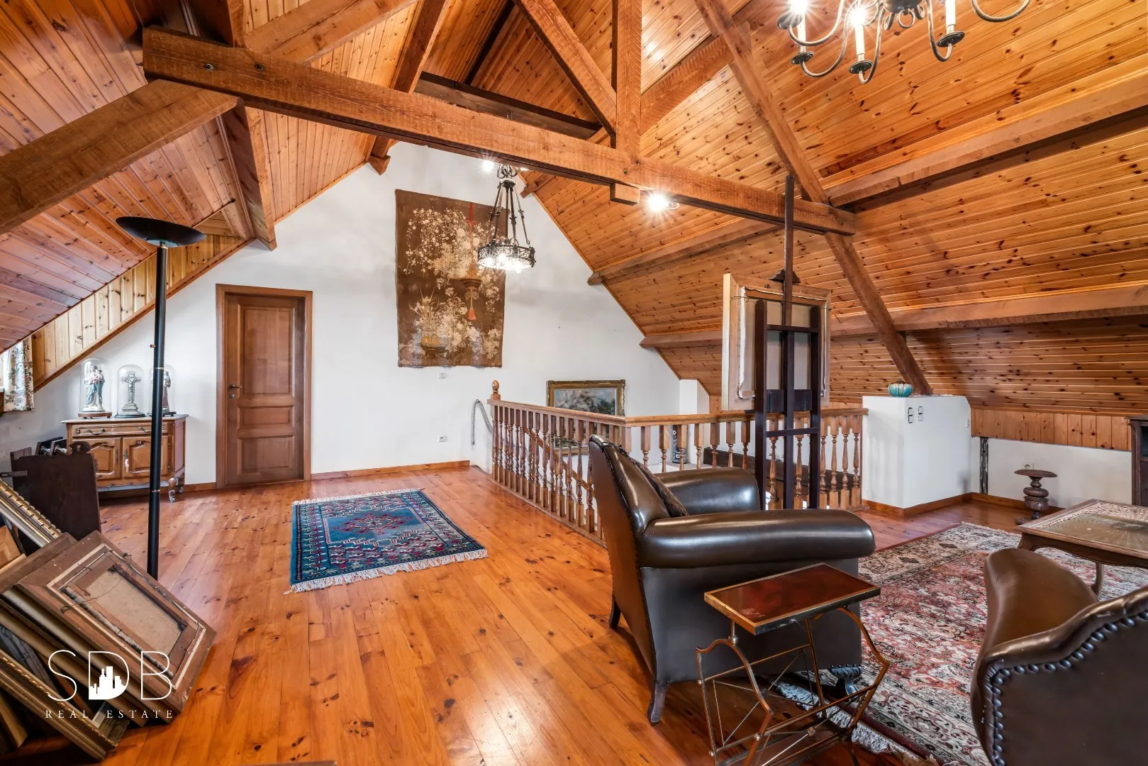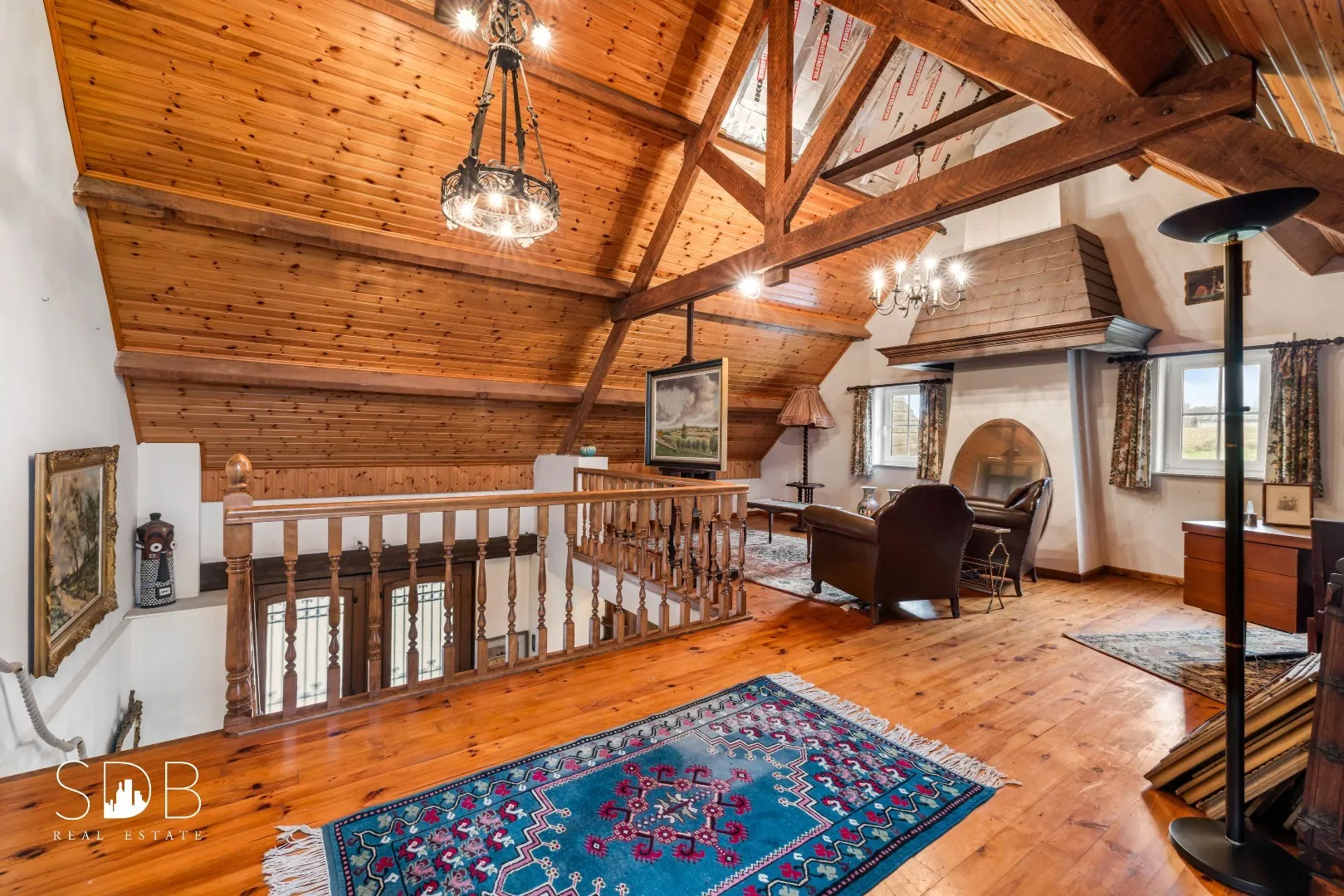 Deze leefruimte wordt getypeerd door haar prachtige houtstructuren tot in de nok. De ideale zithoek, leeshoek om tot rust te komen na een drukke werkdag.