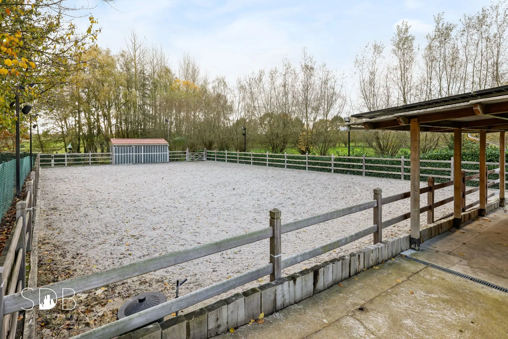 Aanpalend tref je het stalgebouw aan. Deze is uitgerust met 3 paardenboxen en 2 poetsplaatsen waarvan 1 is voorzien van een solarium.