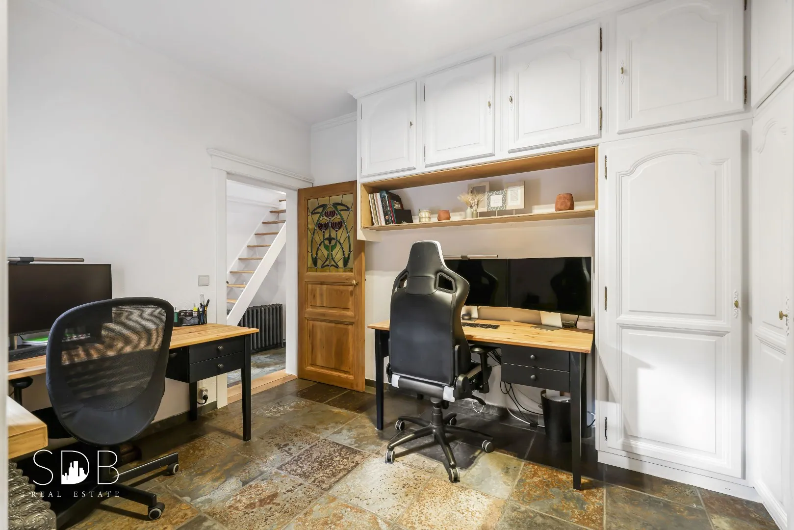 Een afzonderlijke bureauruimte is uitgerust met ingebouwde kasten. Deze Home office biedt de perfecte kijk op uw werk-privé balans.