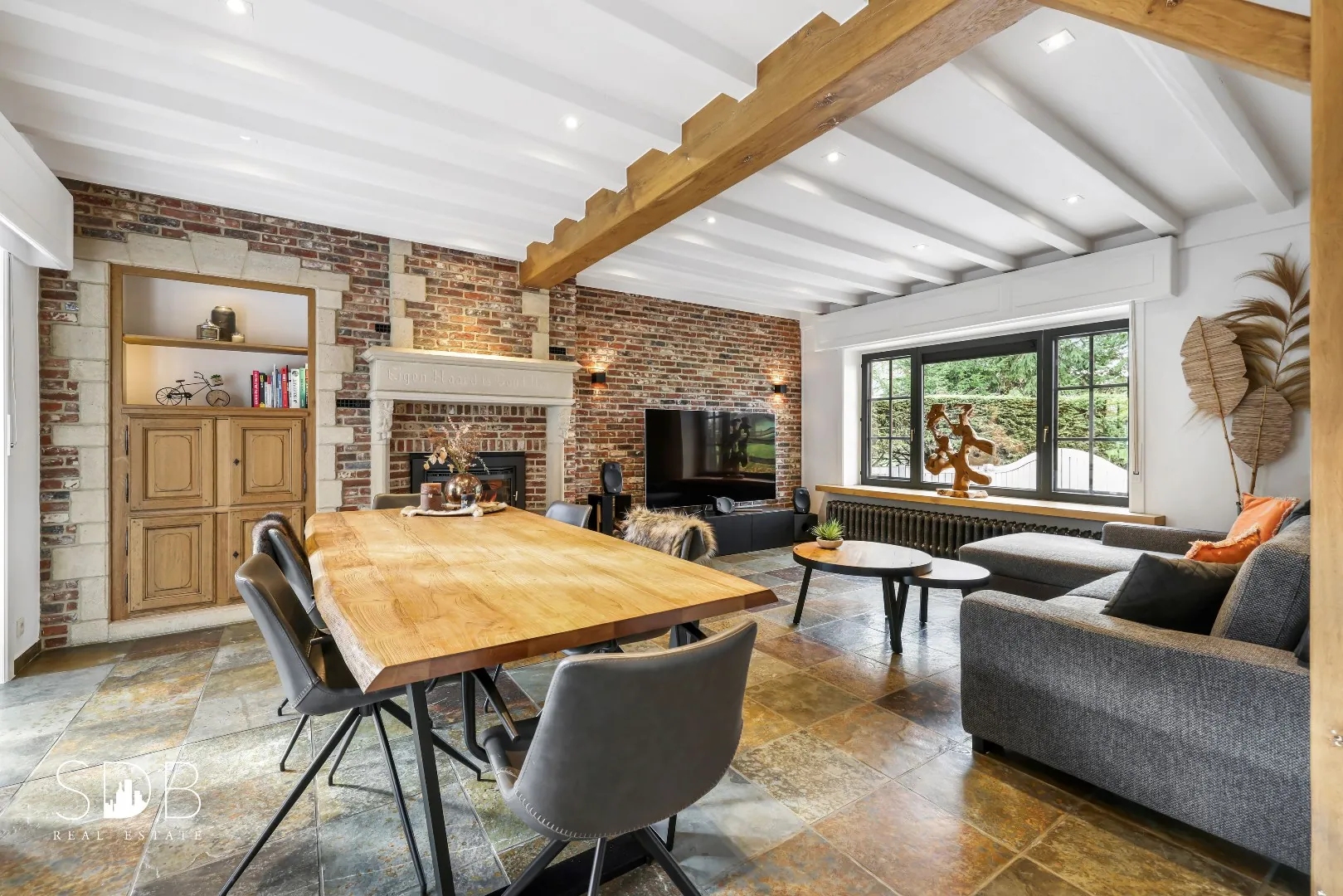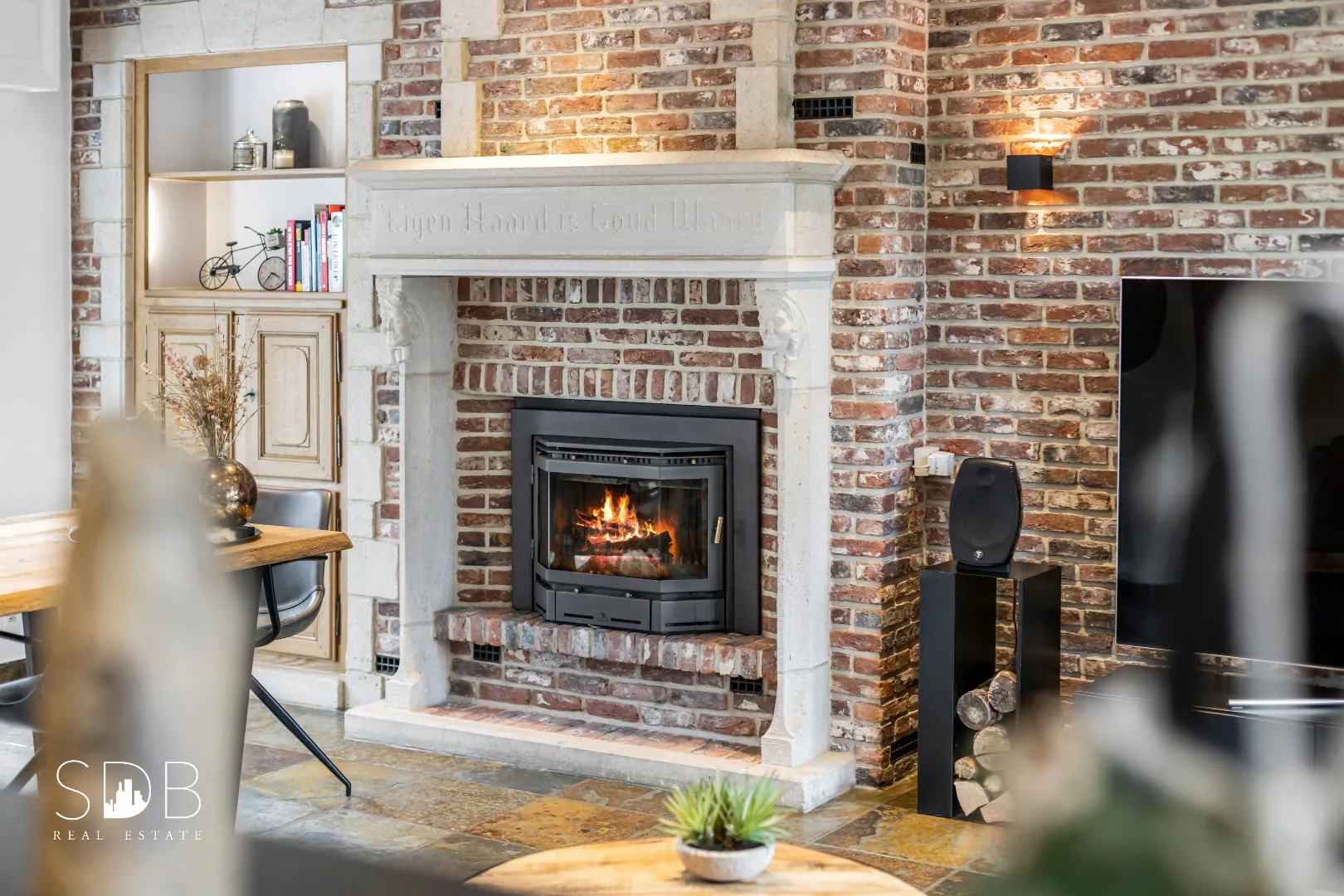 De openhaard alias inbouwcassette en de houten materialen benadrukken de gezellige sfeer die deze leefruimte met zich meebrengt.