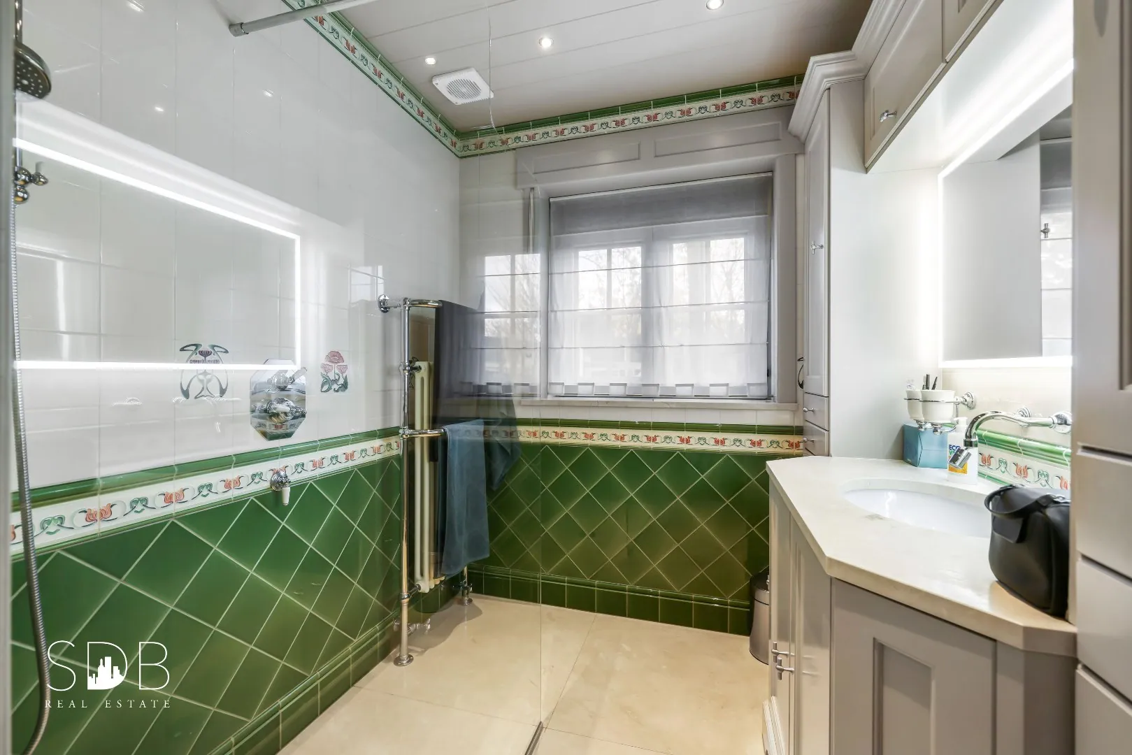 Evenals op het gelijkvloers treffen we een authentiek badkamer aan. Voorzien van een enkel lavabomeubel en een inloopdouche.