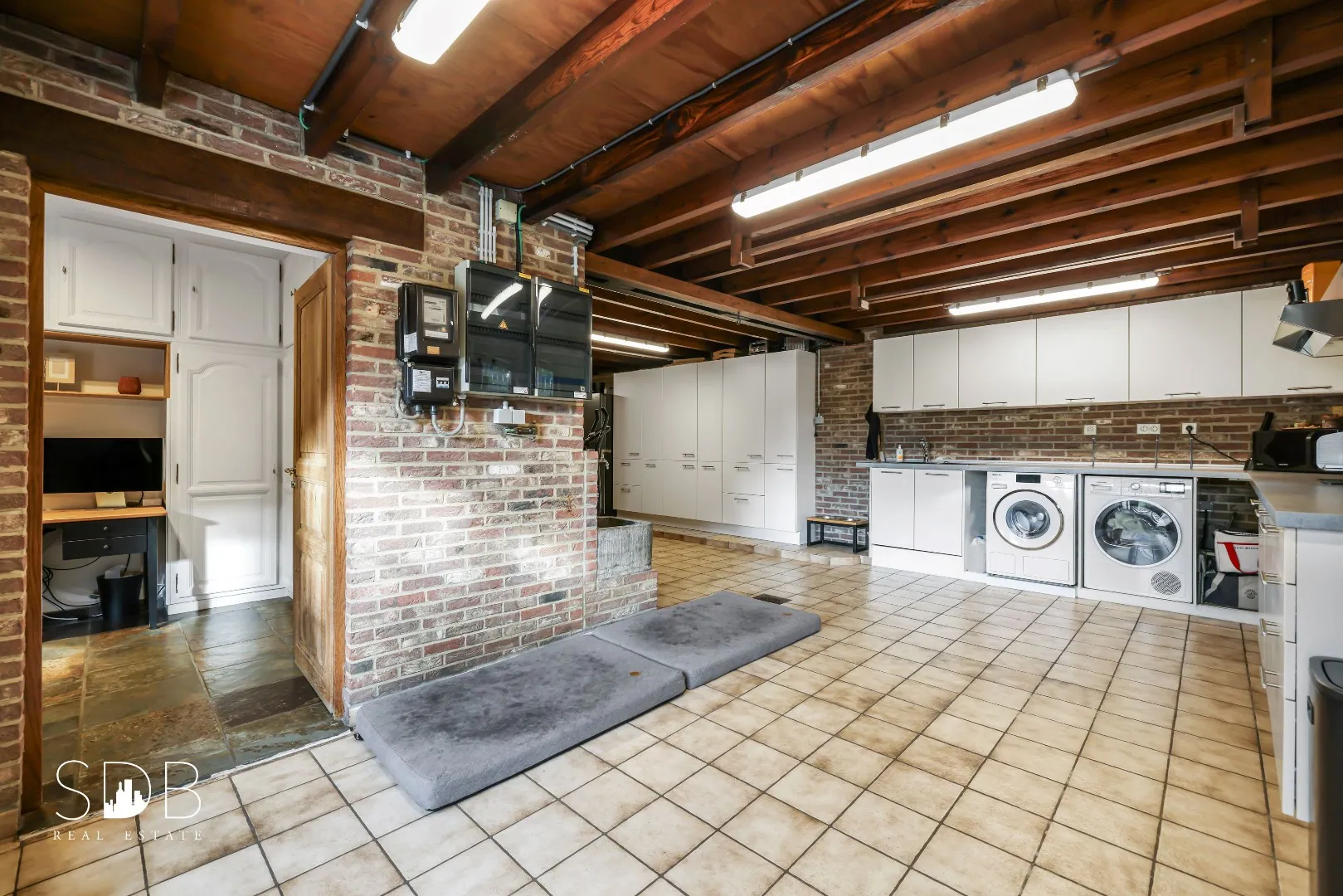 Daarnaast tref je een grote bergruimte alias wasplaats aan. Welke is uitgerust met de nodige aansluitingen voor wasmachine en droogkast. Tevens biedt deze grote ruimte heel wat stockagemogelijkheden.