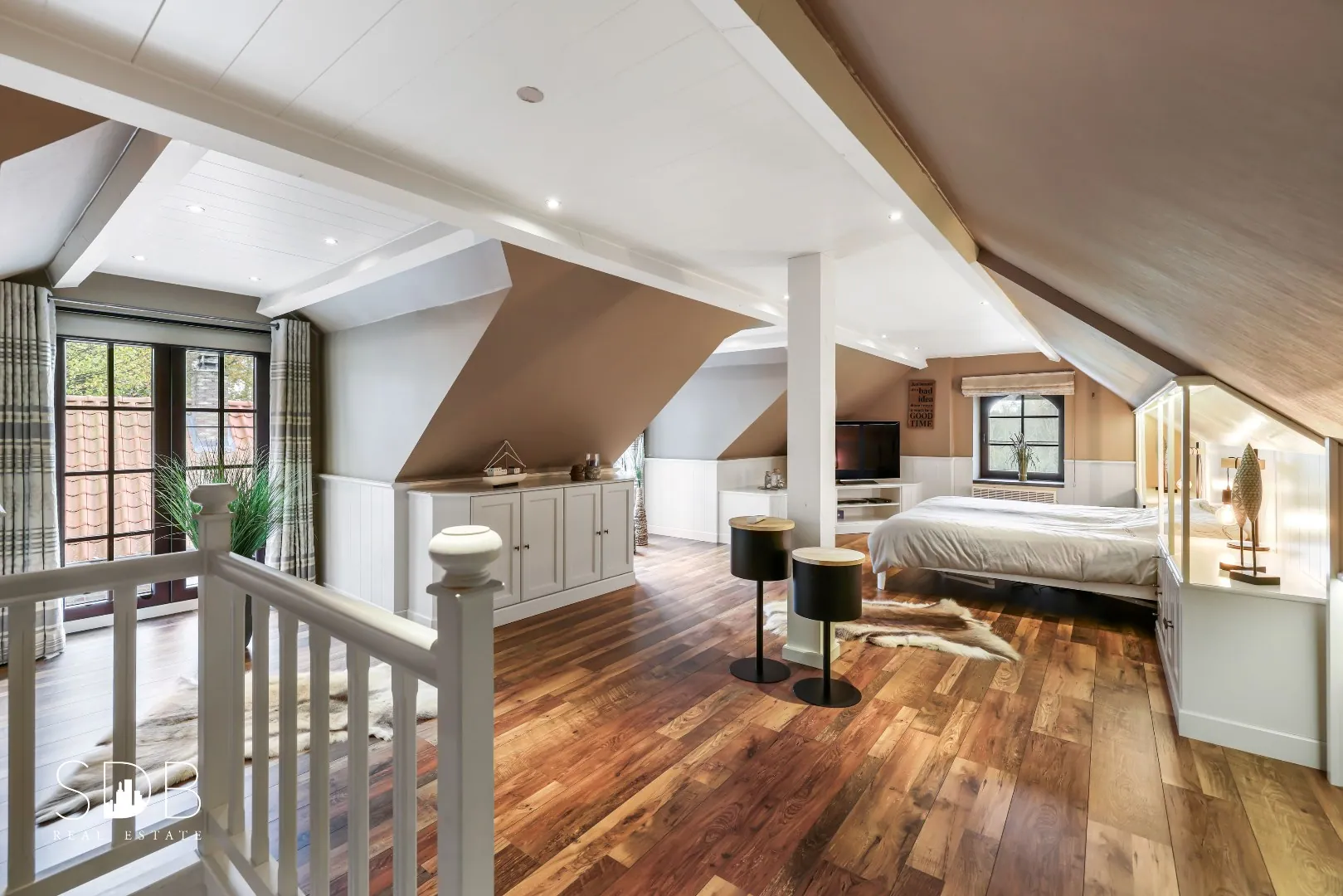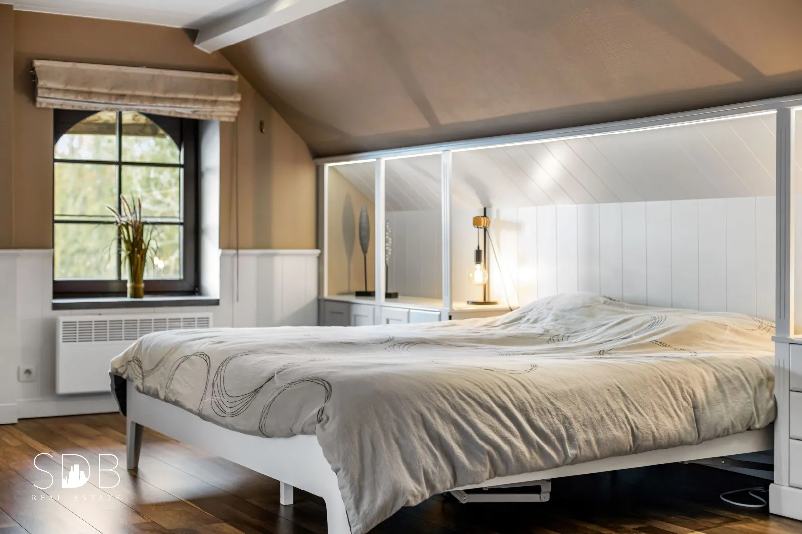Op de eerste verdieping bevindt zich een master bedroom met een opp. van 60m² die opgedeeld is in 2 ruime slaapkamers.