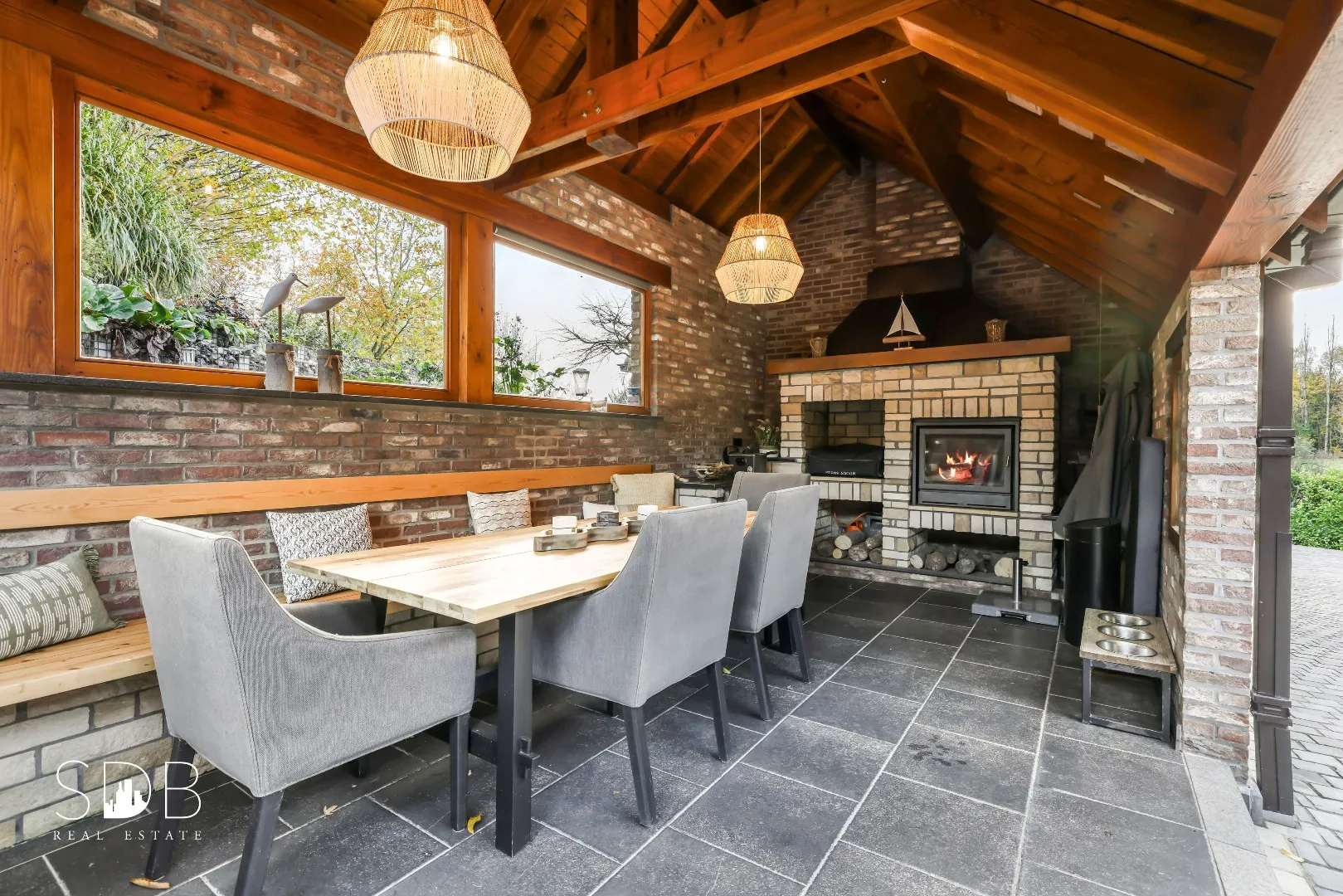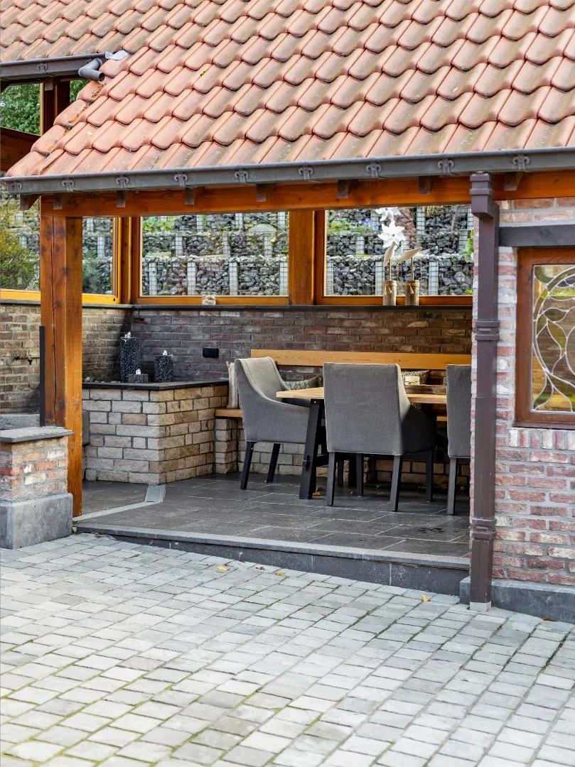 Buitenshuis genieten we van een extra indoor, outdoor leefruimte. Het voorziet tijdens elk seizoen een aangenaam binnenklimaat.